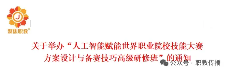 为深入学习贯彻党的二十届三中全会精神,深入贯彻落 实《关于推动现代职业教育高质量发展的意见》《全国职业院校技能大赛执行规划(2023—2027年)》等文件精神,坚持“以赛促教、以赛促学、以赛促改、以赛促建”的理念,精准把握世界职业院校技能大赛前沿动态,系统提升教师教学能力与学生竞赛水平,推动“岗课赛证”综合育人模式改革,为帮助各参赛团队精准把握赛事新趋势、深度理解评分核心逻辑,并借助人工智能(AI)技术优化备赛全流程。聚焦职教拟举办“人工智能赋能世界职业院校技能大赛方案设计与备赛技巧高级研修班”。现将有关事项通知如下: