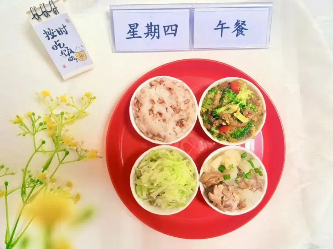 红米大米饭、白萝卜炖水鸭、西兰花甜椒炒肉、素炒包菜