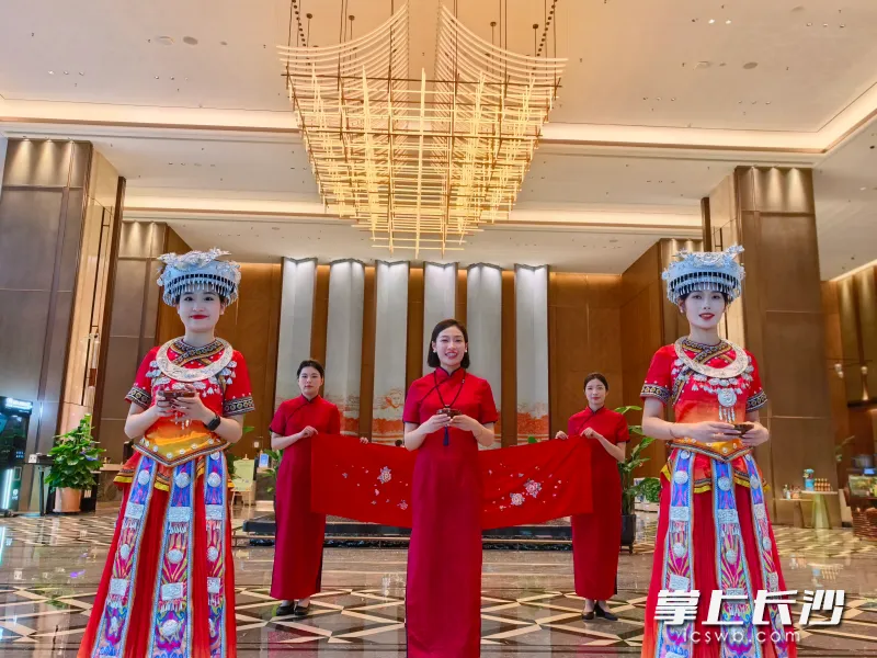 “可触摸的湖湘文化博物馆”,是她打造的秘诀。前台一侧的“融鑫堂”,来自湖南省湘绣研究所的饶婷正在绣架前飞针走线,丝线翻飞间,一幅生动的万里长城湘绣渐渐成型。几位住客围在一旁,看入了神,忍不住询问能否体验。饶婷笑着递上绣针,客人小心翼翼地绣上几针,旁边还设有“万人绣长城”绣簿,绣者可签名留念。“我们把这个保存下来,十年二十年后,客人回来说‘看,这是我当年绣的’,与客人长久的情感链接就建立了。”于静介绍。
