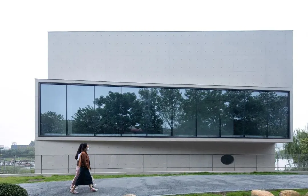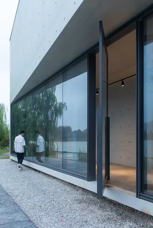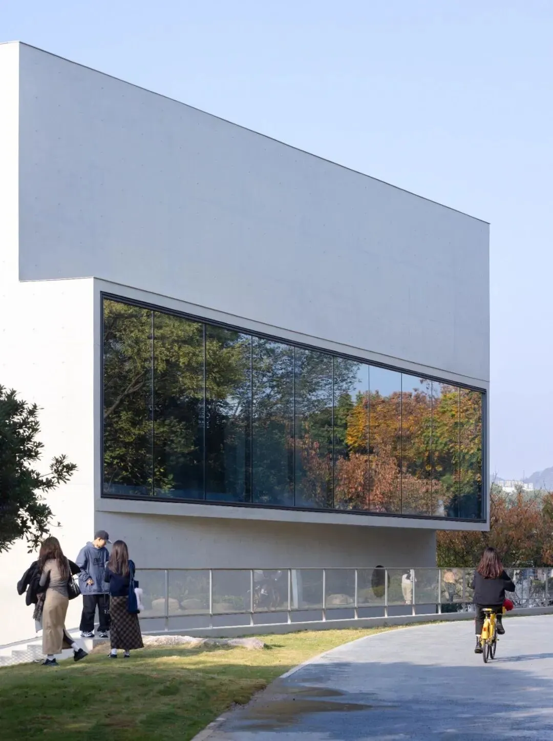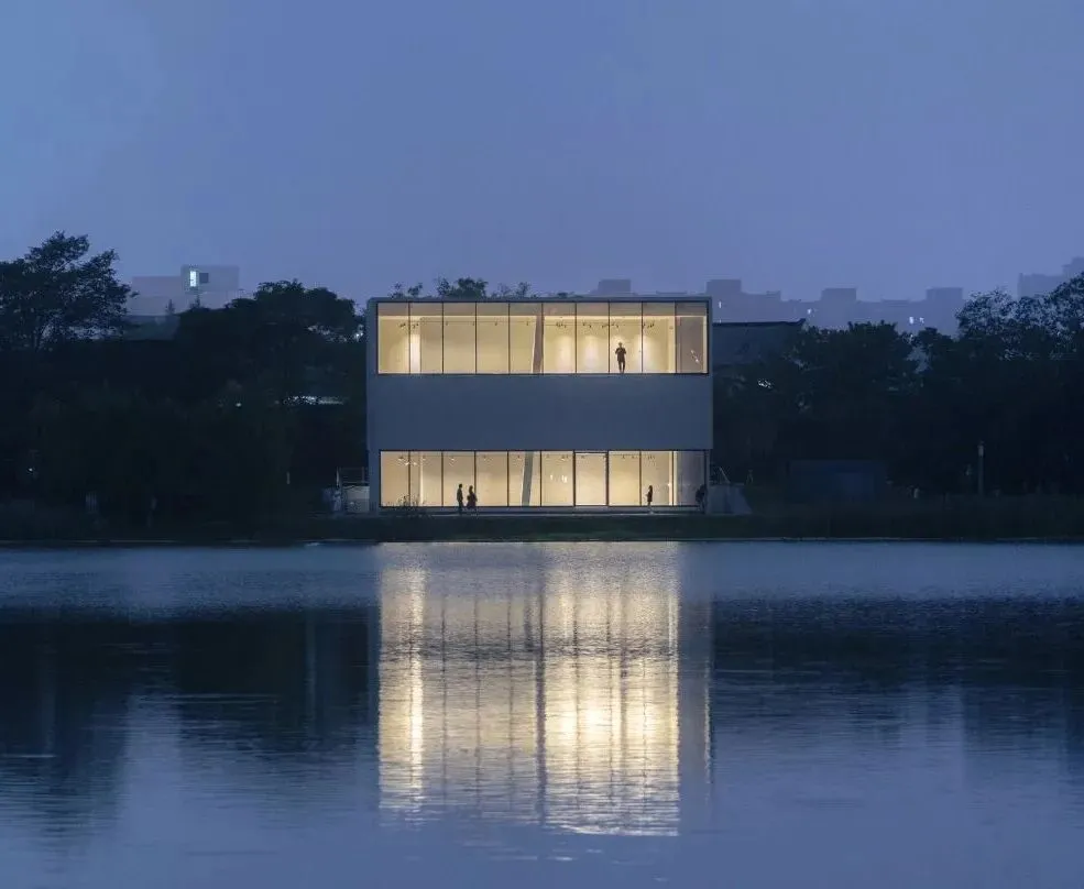 凭借严谨的逻辑控制,建筑在自然与人工环境的叠加中,并未选择模仿自然,而是以理性之光与自然韧性交相辉映。镜像旨在成为自然中的一面镜子,映射周边水、树、山三重景观维度。建筑与其水中倒影亦构成镜像关系,隐喻人工与自然环境的叠合与互映。