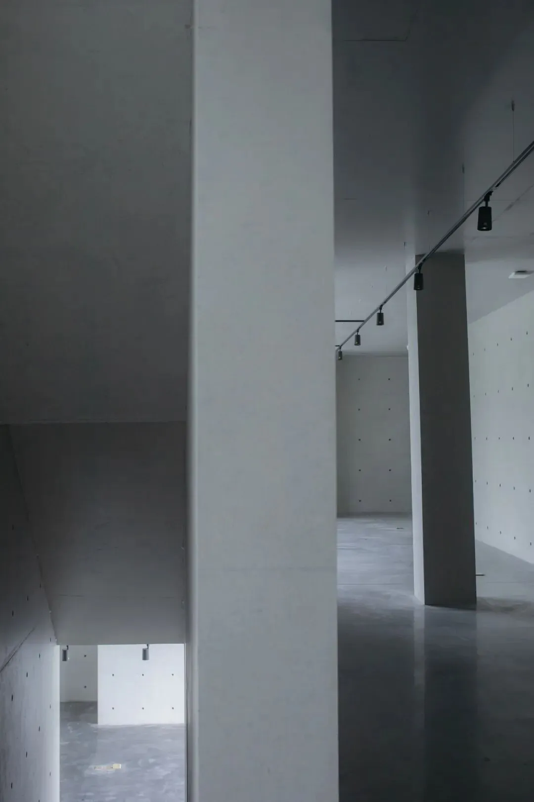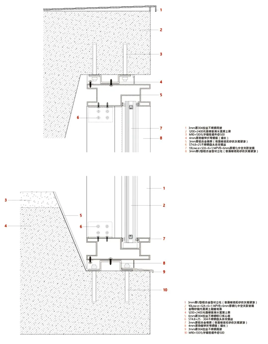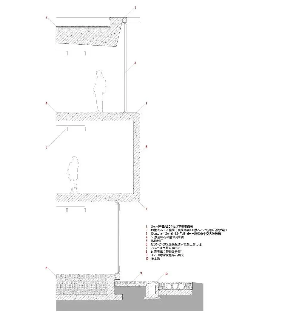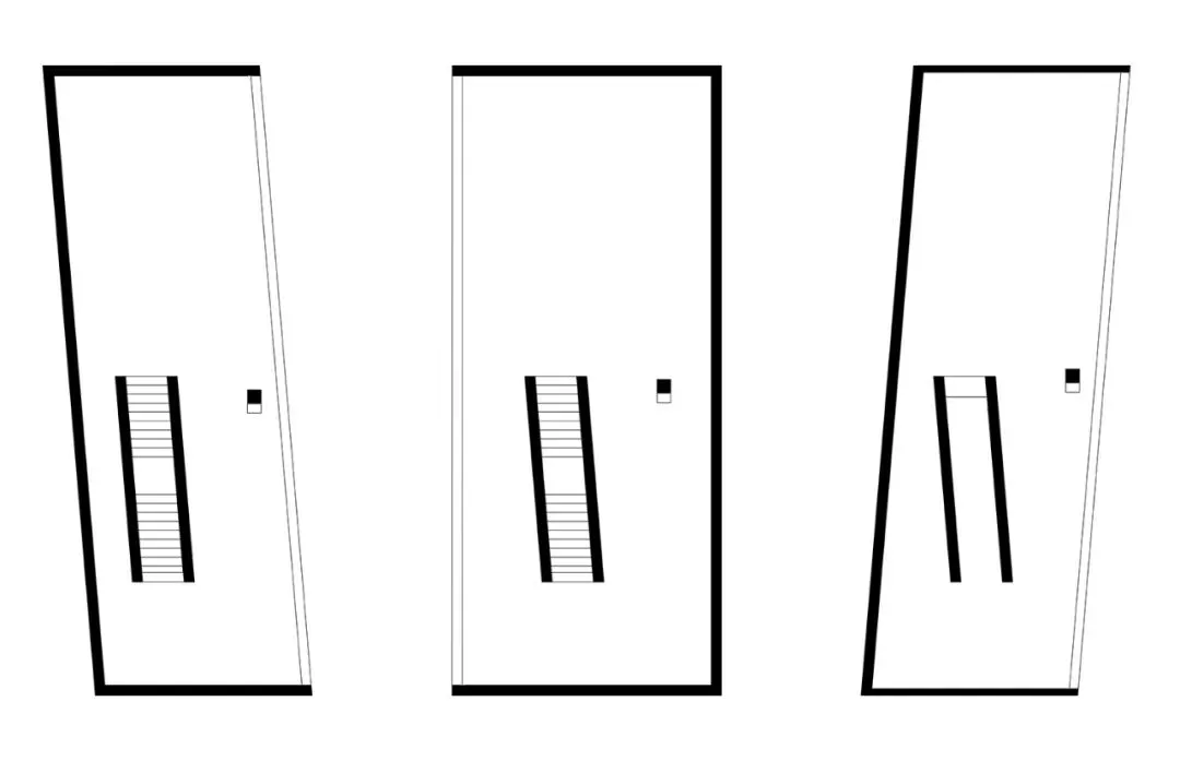 构造细节方面,玻璃幕墙下方的金属排水板、顶层幕墙上方的异形截面反梁,以及设备井道面向幕墙的斜向处理,均体现出建筑在细部控制上的严谨态度。建筑形体在竖向上经历两次扭转,平面呈平行四边形,内部立柱倾斜设置,整体构成逻辑基于斜向建构系统,并在三维空间中贯穿始终。