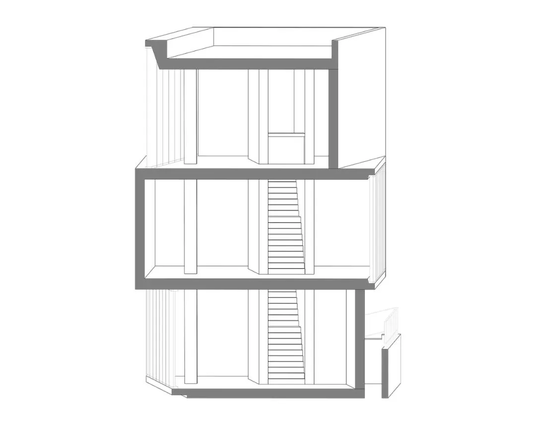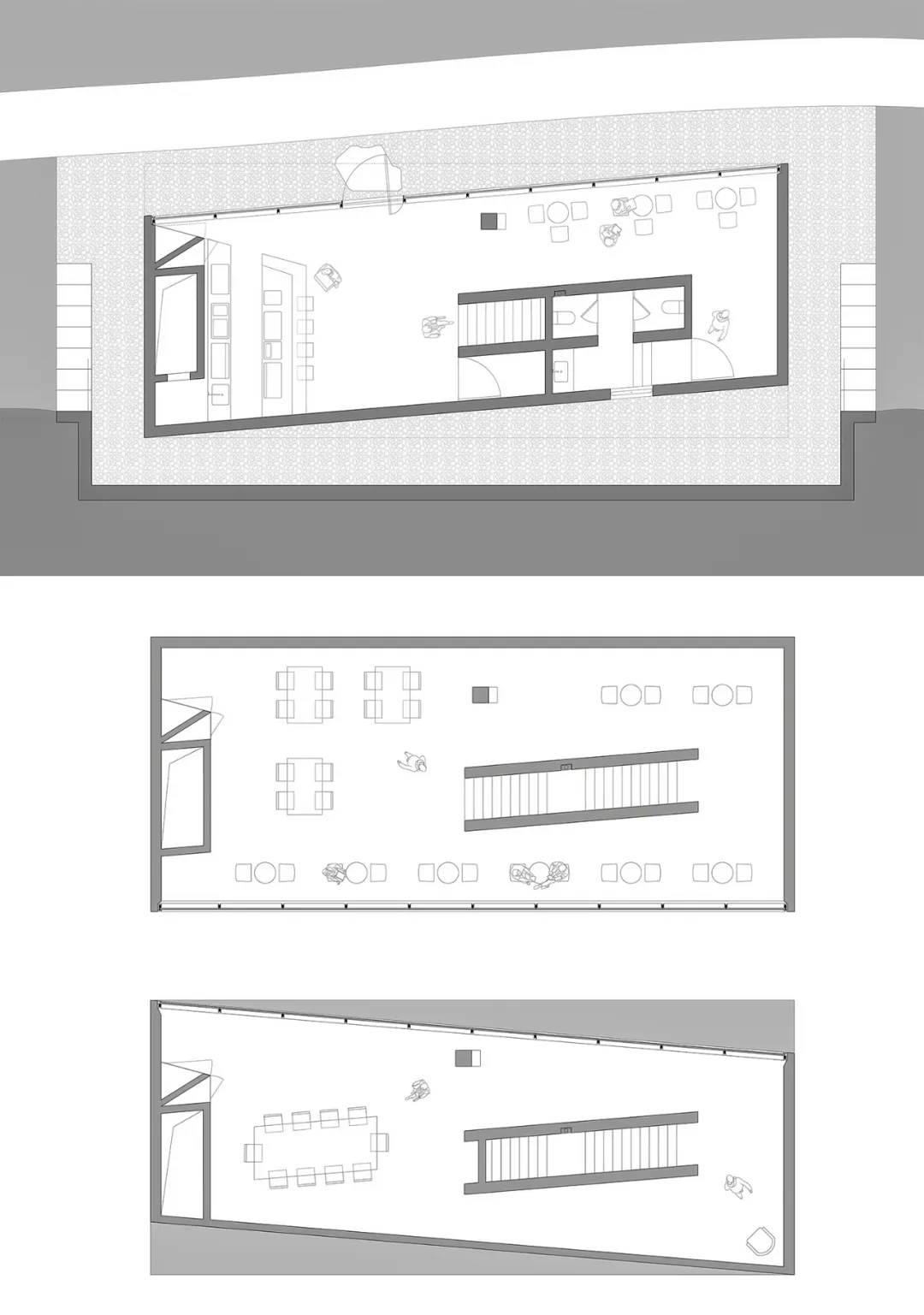 在景观层面,该区域视野开阔,缺乏视觉屏障。为呼应景观的多维性,建筑一层向水面敞开,二层体量可观察到后方步道上的人流活动,形成若即若离的对话关联,三层则提供眺望岳麓山与湖面的远眺视野。由于建筑形态狭窄,设计有意强化了这种极端的景观体验。