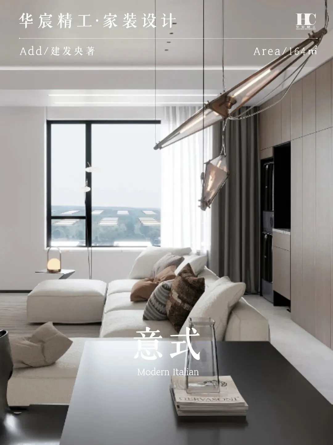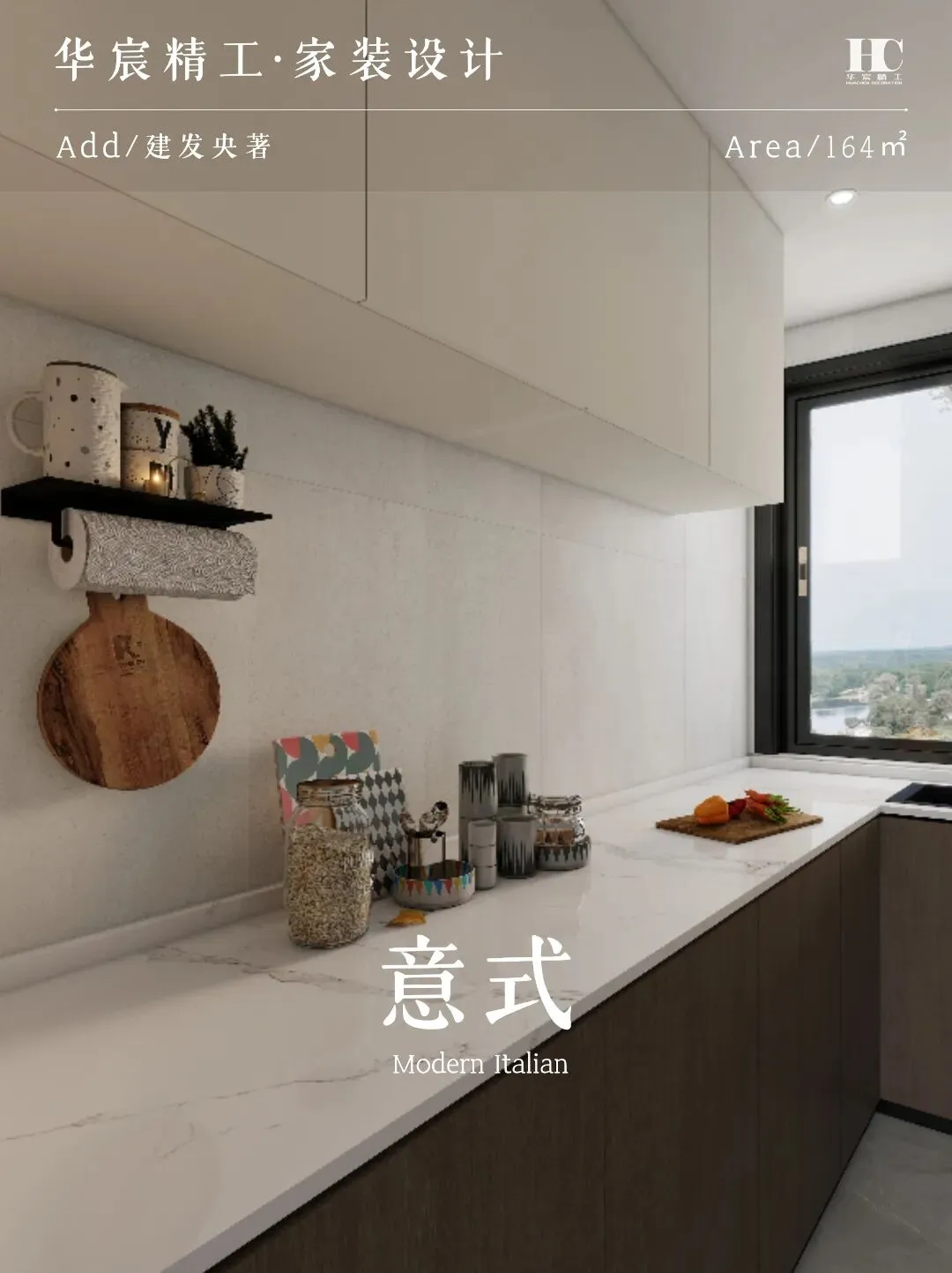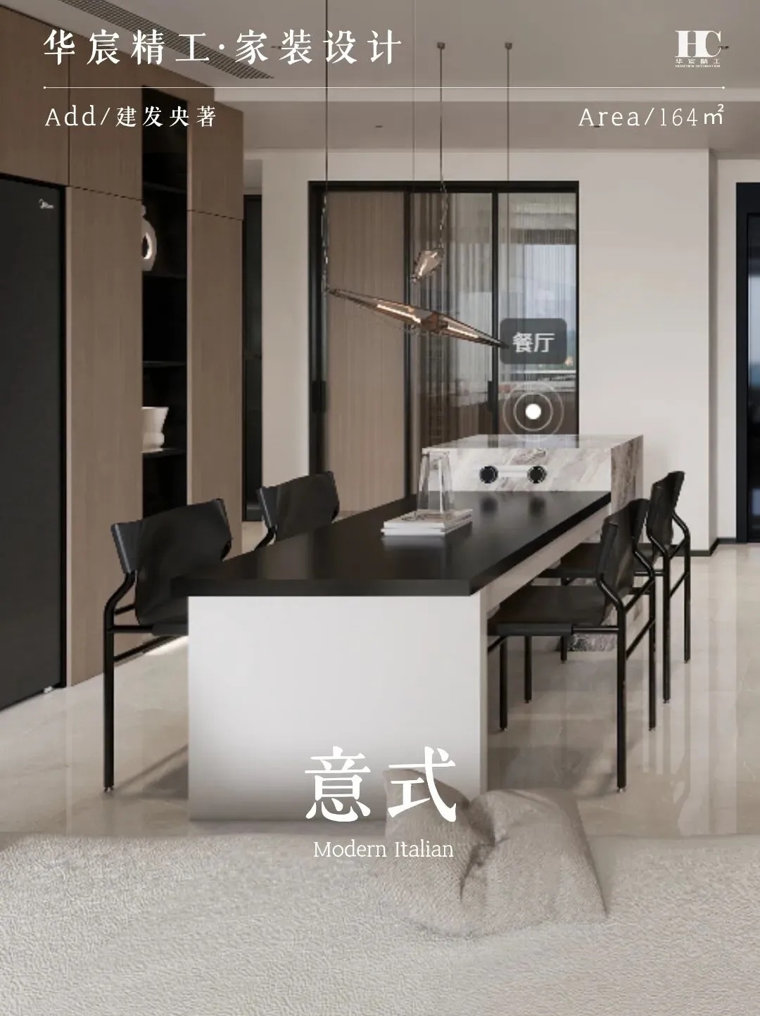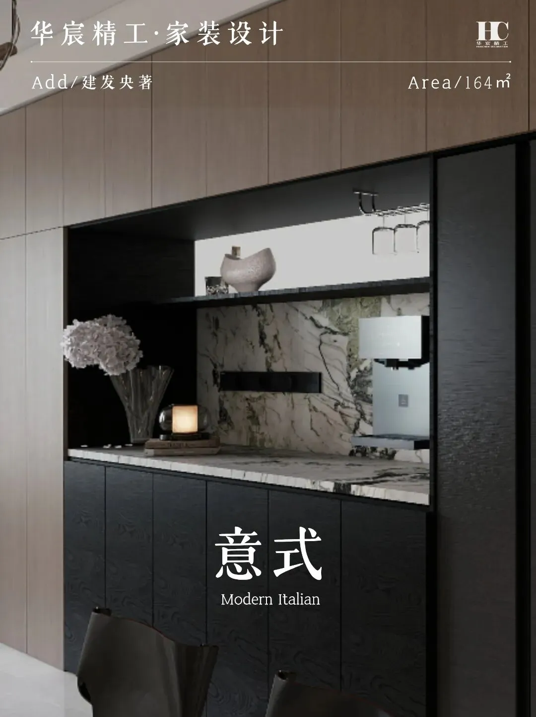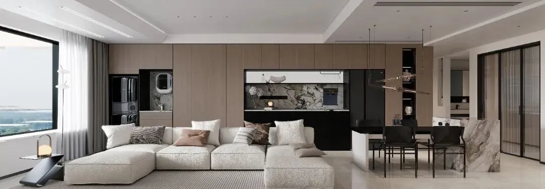 ▶ 以米白、浅灰、胡桃木为基底,搭配深黑与大理石纹理碰撞。