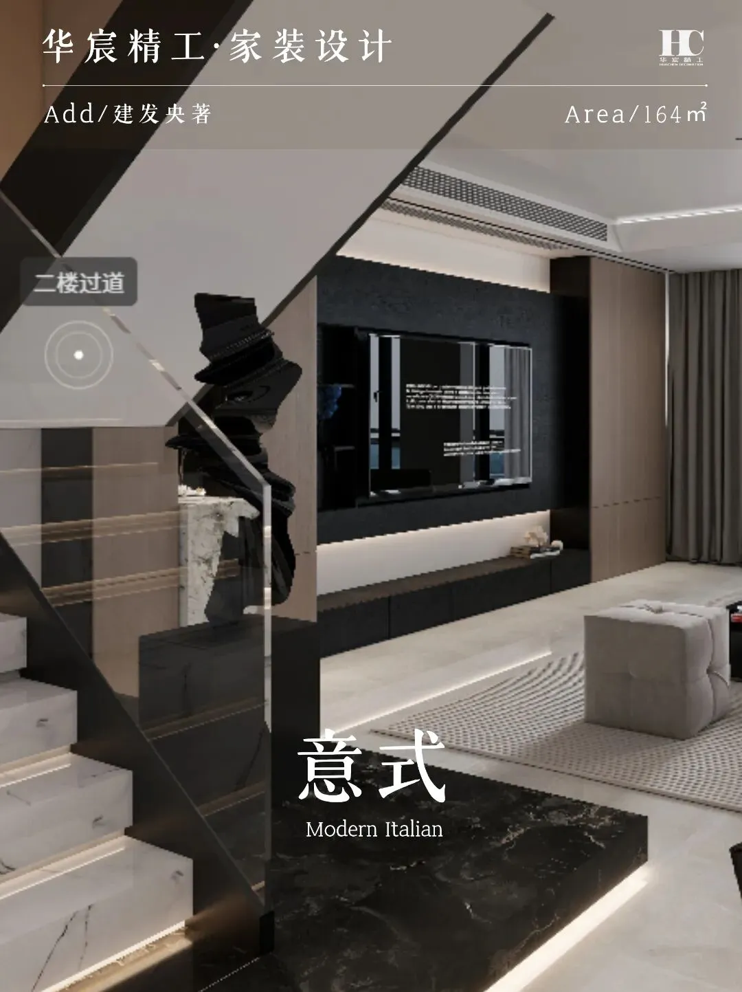 楼梯采用玻璃扶手 + 大理石踏步设计,既安全又轻盈,成为空间里的艺术装置。