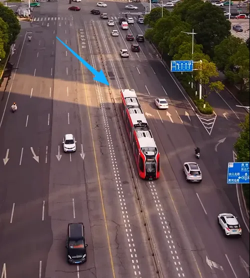 智轨列车跑起来的时候在马路中间,沿着专门的虚拟路道走。