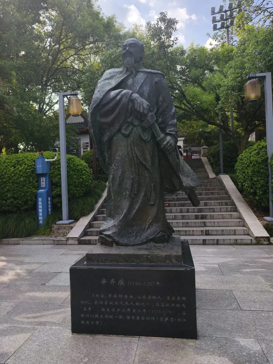 朋友分享了一组辛弃疾含"马"的诗词句子,瞬间把我拉回到长沙营盘路的某个午后。辛弃疾一身戎装,满目悲愤,手中牵着一匹魁骏的战马。只有这座雕塑,还在替八百多年前的那位将军,诉说着这里曾经发生过什么。他静静地立在台上,望着脚下的江水。那是他笔下的江水:南宋淳熙二年(1175年),36岁的辛弃疾出任江南西路提点刑狱,驻节赣州。他来这儿是为了平叛——茶商赖文政起兵,官军屡剿屡败。辛弃疾到任后,仅用三个月就平息了叛乱,展现了他非凡的军事才能。也是在赣州,他写下了那首震古烁今的《菩萨蛮·书江西造口壁》:江水东流,青山依旧,可那个"西北望长安"的人,一生都没能真正回到北方。从赣州离开后,辛弃疾辗转湖北,终于在1179年(淳熙六年)来到长沙,担任知州兼湖南安抚使。初到湖南时,他曾与朋友王正之在小山亭对酒赋词。那首词里有一句,读来令人心碎:斜阳西下,烟柳迷离,他看到的不是风景,是自己正在消逝的人生。直到淳熙七年(1180年),辛弃疾任湖南转运判官,后又知潭州兼湖南安抚使,英雄终于有了用武之地。他骤起凌云之志,力主创建一支精锐军队——飞虎军,以备武力收复国土。他把军营建在了五代时期马殷在长沙的旧营垒故地。那个地方,今天叫营盘街。可是长沙人始终用"营盘街"这个名字,记着那位在这里秣马厉兵的将军。在长沙的两年多时间里,辛弃疾一边筹建飞虎军,一边也没有放下手中的笔。有些词,写的是家国情怀。有些词,写的是送别友人的真挚情感。他借长沙道中妇人的口吻,写的是自己的心事。那"立尽西风雁不来"的,何尝不是他等了一生的北伐诏书?1181年,辛弃疾牵马离开长沙。飞虎军后来几经变故,最终湮没在历史尘埃中。但那条营盘街,却一直留到了今天。