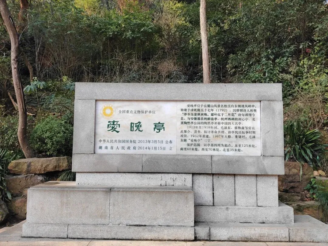 1913年至1918年间,毛泽东、蔡和森等常在此聚会、读书、探讨革命真理。该亭抗日战争时期被毁,1952年重建,1987年大修。重建时,毛泽东题“爱晚亭”三字。