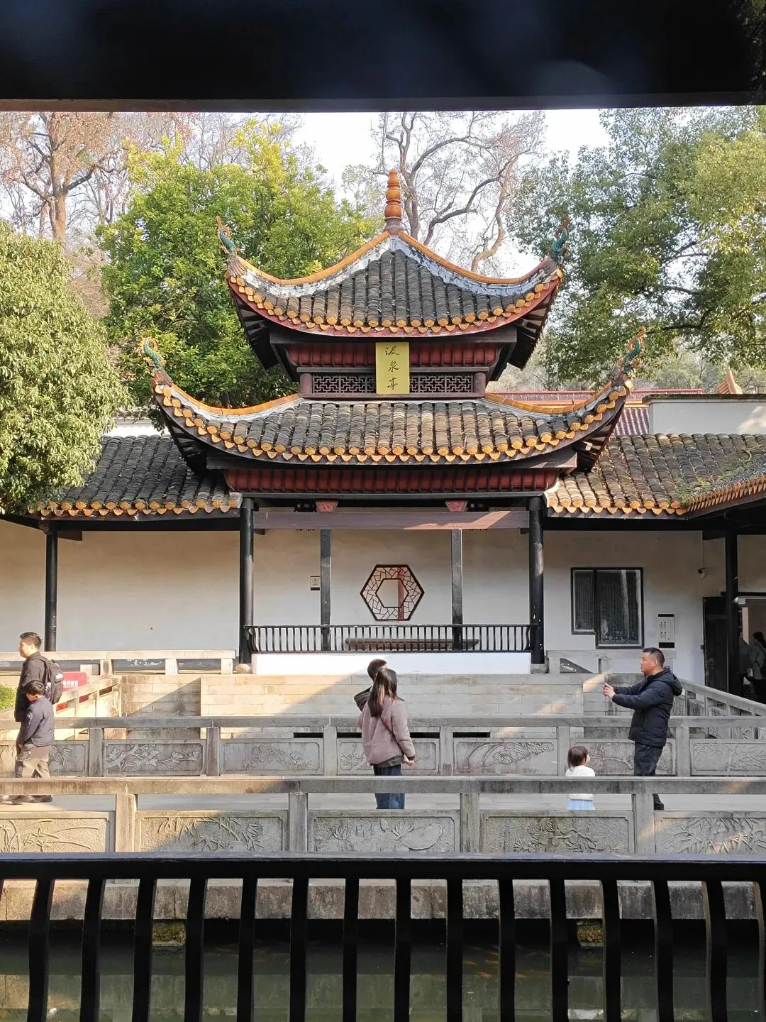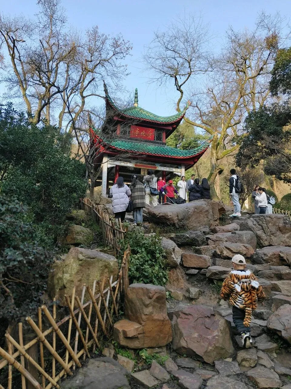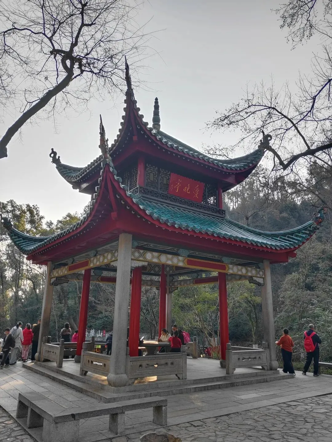 沿着红楼前的“登高路”一直向前爬小坡进入景区,来到爱晚亭。 爱晚亭原名红叶亭,位于岳麓山风景名胜区内东侧清风峡中,始建于清乾隆五十七年(1792)。因唐朝诗人杜牧“停车坐爱枫林晚,霜叶红于二月花”诗句而得今名。与安徽滁县的醉翁亭、杭州西湖的湖心亭、北京陶然亭公园的陶然亭并称中国四大名亭。