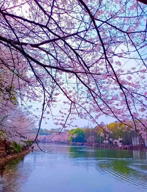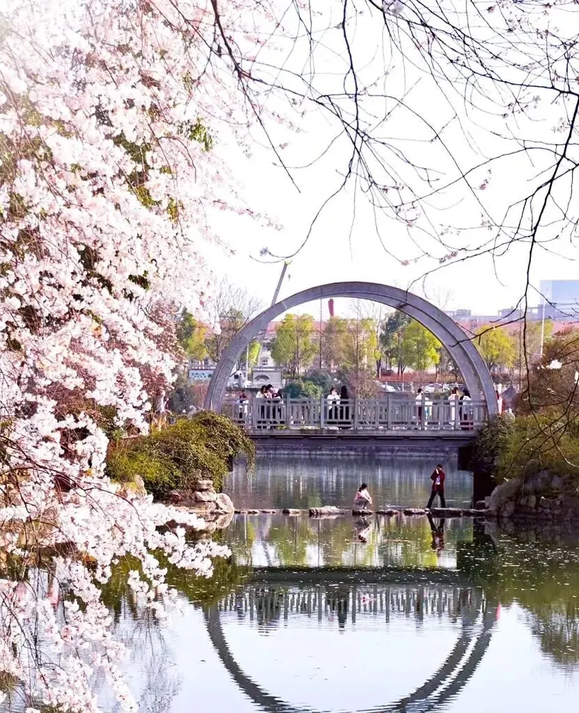 长沙人看早樱,大多会来望月公园。园子里有近 300 株樱花,沿着铜盆湖种,望月桥、濯清桥在湖边,站在桥上看,花影映在水里,特别有江南的感觉。公园全天开放,不用预约,但人多的时候可能会限流,每年 3 月初就有樱花冒头,很多市民都会去拍照片。