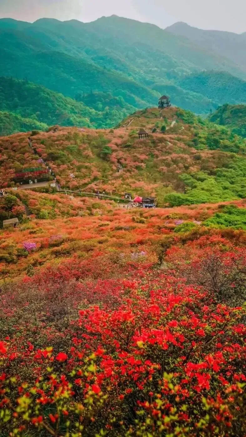 大围山有 10 万亩野生杜鹃,品种特别多,映山红、云锦杜鹃都有。漫山遍野的杜鹃花,和青山、云海、古刹搭在一起,就像一幅画。核心的赏花区在七星岭(就是湘东第一峰)、红莲寺附近,不想走路的可以坐景区观光车,体力好的也可以徒步登山,近距离感受高山花海的震撼。