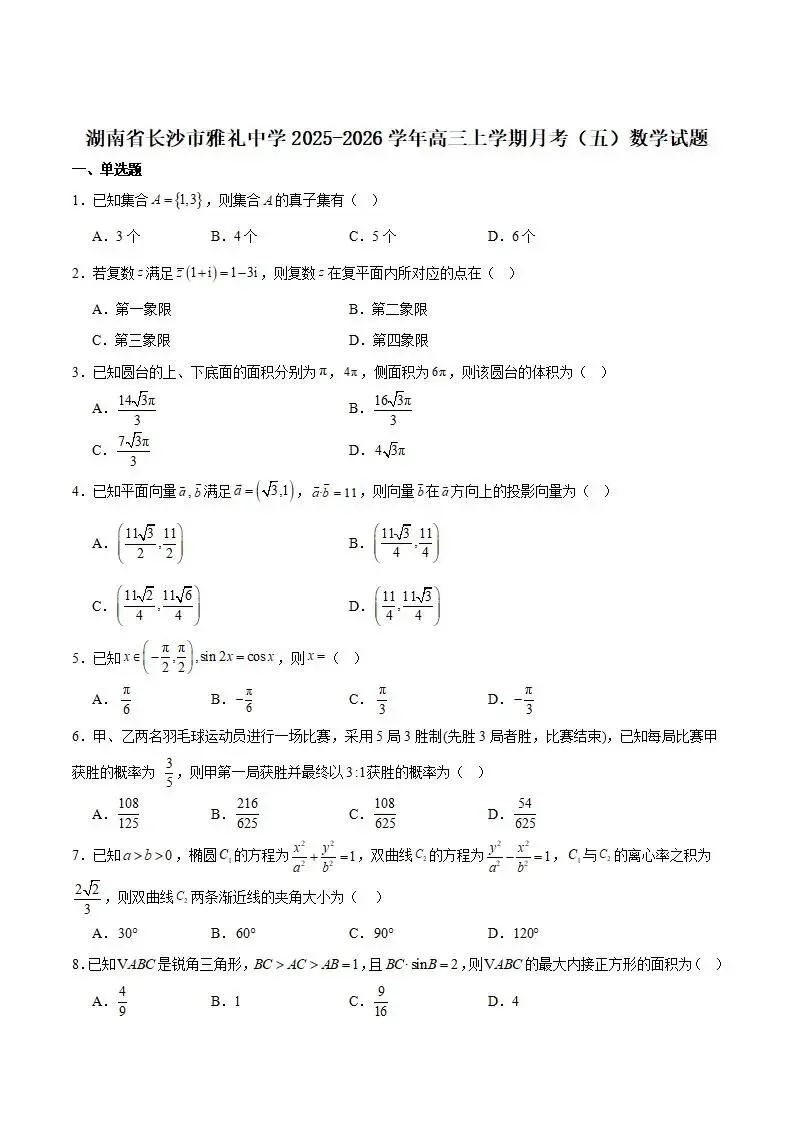 《高中试卷》长沙市雅礼中学2026届高三上学期月考(五)数学试卷(含答案)