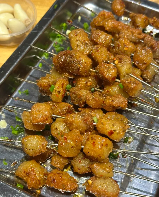 【岳阳烤牛油】这道菜讲究的是"火候"和"小"。牛油切成指甲盖大小的方丁,串在细铁签上。炭火要旺,手速要快,撒上一把孜然和辣椒面。烤到牛油表面微焦,滋滋冒油时立马离火。送进嘴里,牙齿轻轻一合,"噗"的一声,奶香味的油脂在嘴里爆开,不腻,只有满口的香。