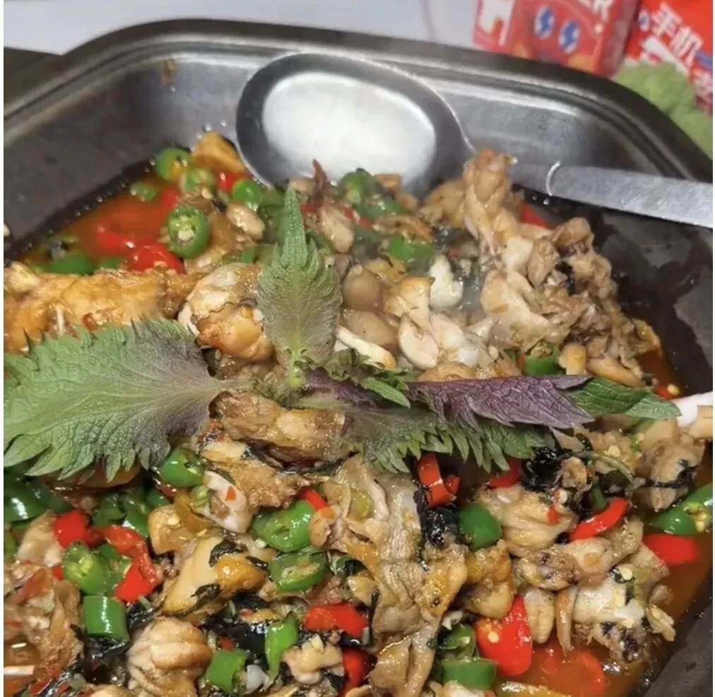 这招牌紫苏牛蛙锅一端上桌,哇塞,那浓郁的香味瞬间扑鼻而来,直接把我的馋虫给勾了出来。满满一大锅牛蛙,堆得像小山似的,上面铺着一层新鲜的紫苏叶,红绿相间,看着就特别诱人。牛蛙的个头都很大,每一块都处理得恰到好处,肉嘟嘟的。夹起一块牛蛙,轻轻一咬,蛙肉就脱骨了,口感鲜嫩爽滑,仿佛在舌尖上跳舞。紫苏的独特香气与牛蛙的鲜美完美融合,味道浓郁醇厚,咸香微辣,越嚼越香,每一口都让人陶醉其中。锅里的汤汁更是精华中的精华,用来拌饭简直是绝配,米饭吸饱了汤汁的鲜味,一口下去,好吃到能让人多吃几碗饭。