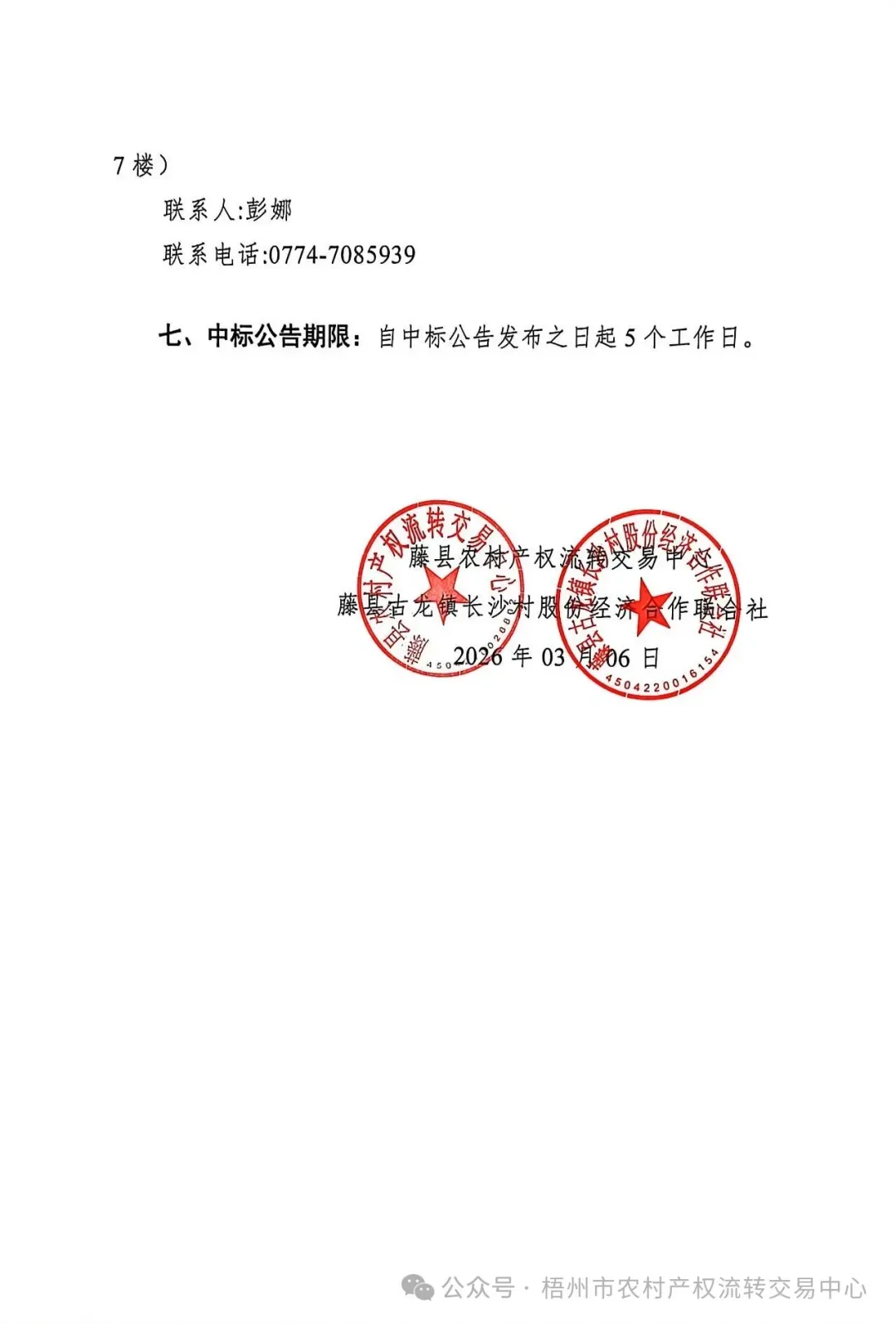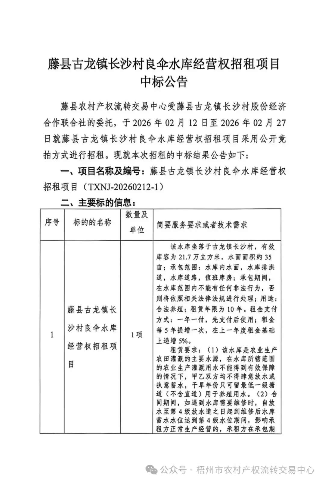 原标题:藤县古龙镇长沙村良伞水库经营权招租项目中标公告