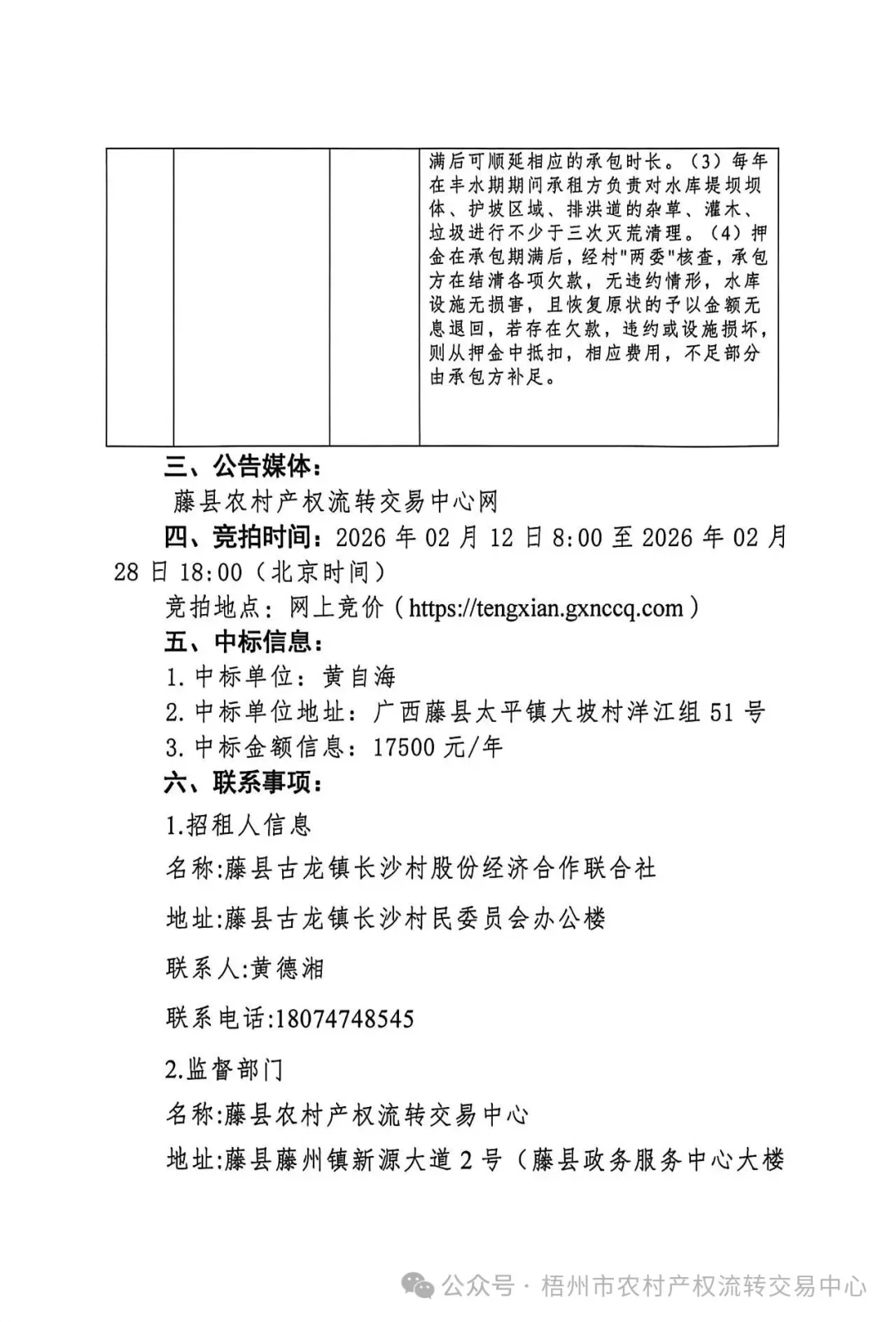 >中标金额17500元,藤县古龙镇长沙村良伞水库经营权招租项目中标公告