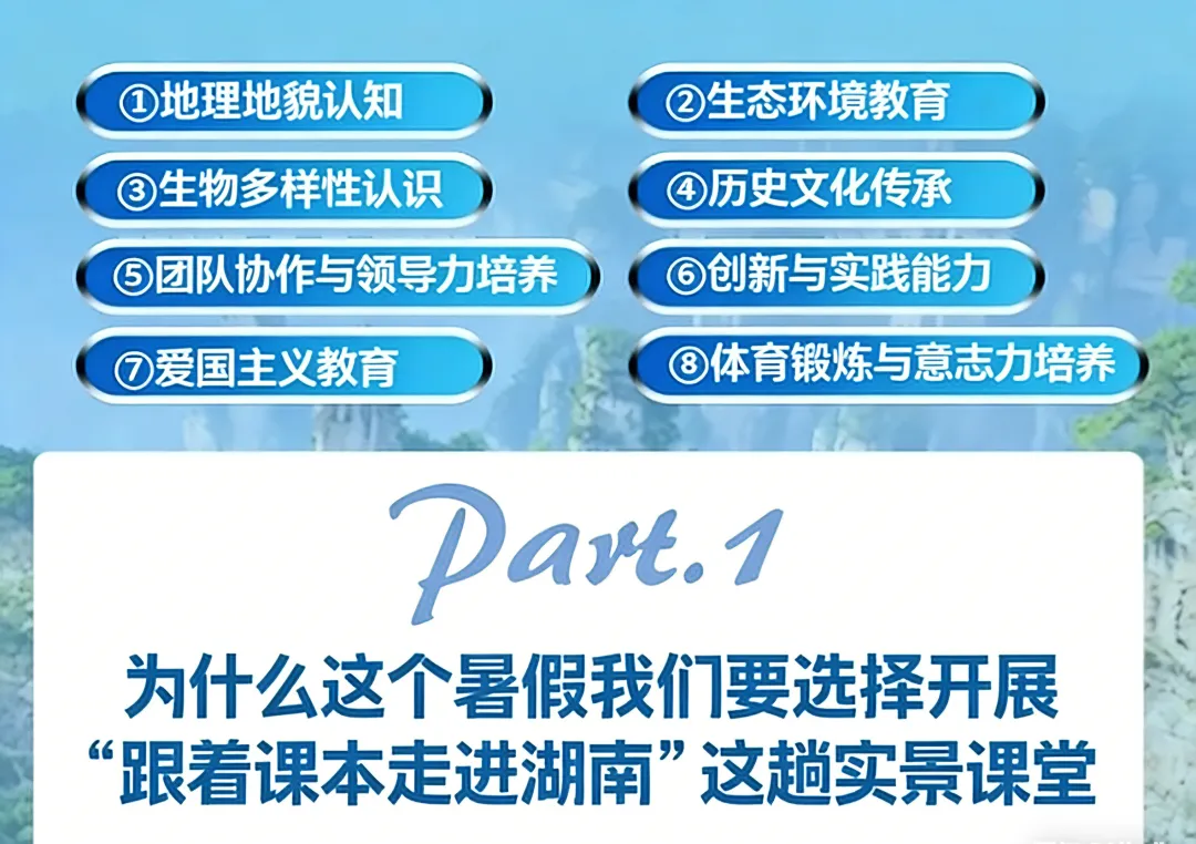 上午:行走的课堂,乘车前往张家界,沿途听导游讲“三湘四水”的地理故事,感受湖湘文化的广度。