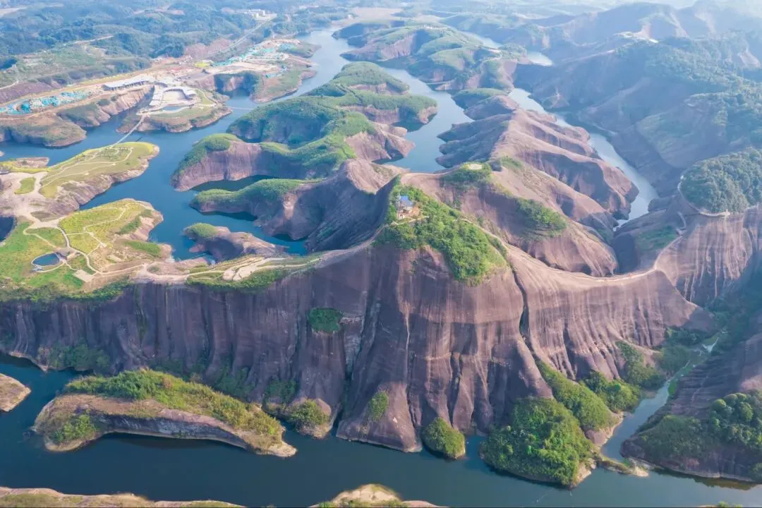 高椅岭丹霞地貌周边有漂亮的水洼点缀,从高空俯瞰,每座山就像是一座岛屿,镶嵌在宝石般碧蓝的水中。