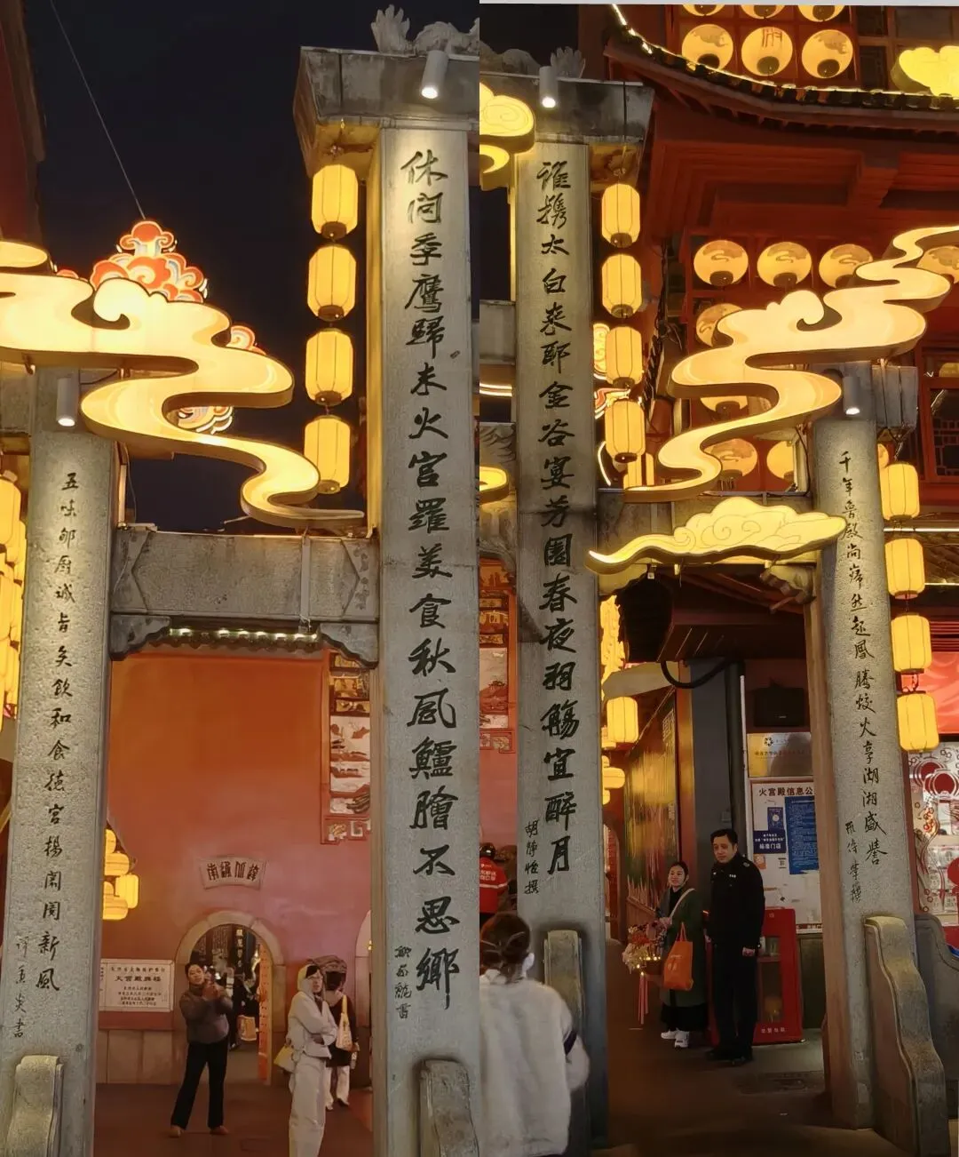 火宫殿正殿立着火神祝融,左侧是三层堂吃,已经八点了,一楼还没有开席。右侧是表演舞台,欢快的歌声让人步履都加快了几分。