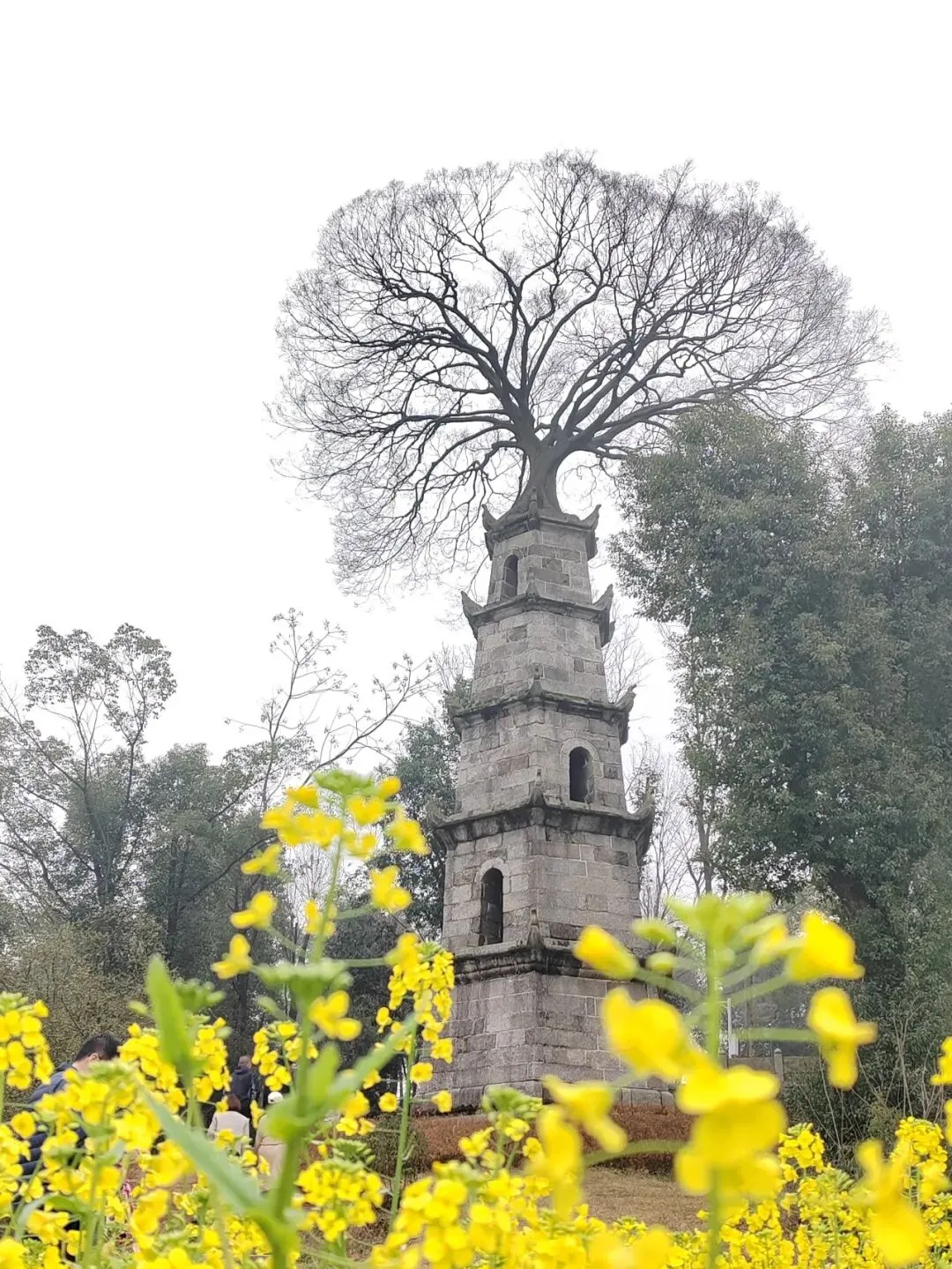随后,大家移步至附近的惜字塔。这座清代的古刹,因“塔树共生”的百年奇观而闻名遐迩。古塔巍然,塔顶一株硕大的古树与其相依相生,仿佛在诉说着岁月的故事,展现了传统文化与自然造化的和谐共生。大家仰望着这一奇景,纷纷感叹大自然的神奇与生命力的顽强。