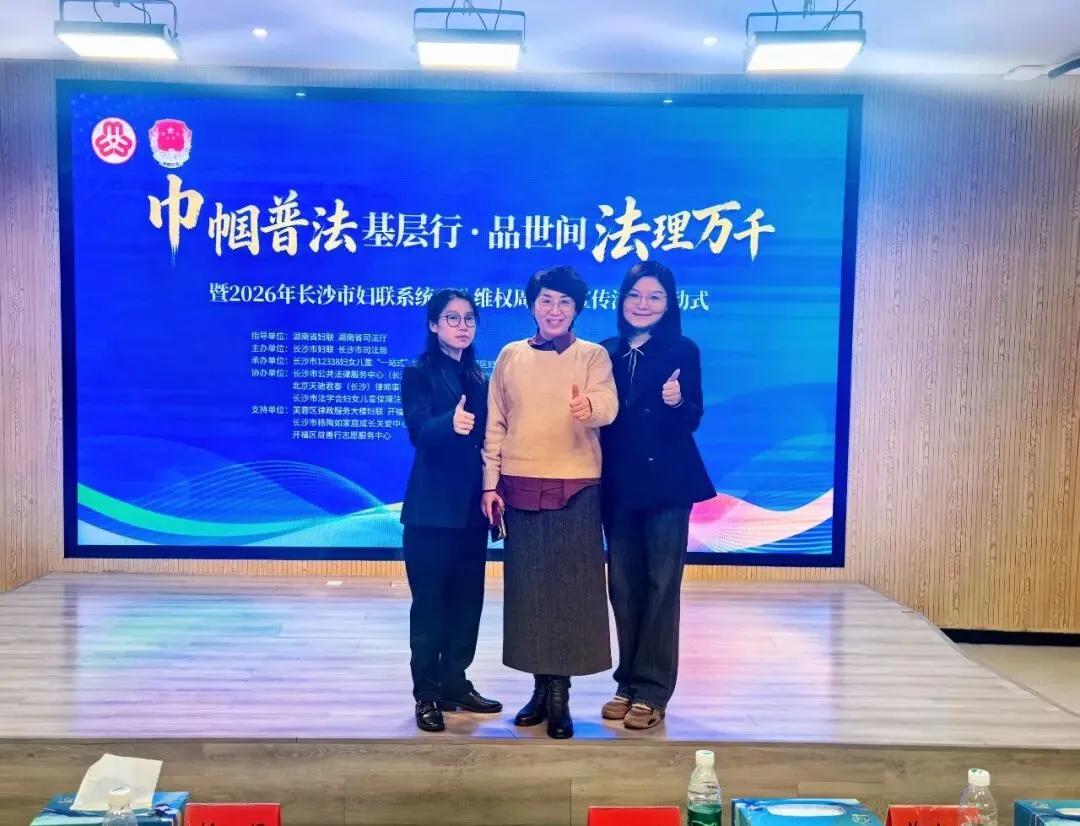 3月7日,由长沙市妇联、长沙市司法局主办,北京天驰君泰(长沙)律师事务所协办的“巾帼普法基层行·品世间法理万千”暨2026年三八维权周普法宣传活动启动仪式在芙蓉区文化馆圆满举行。省妇联副主席张忆寒出席并讲话,市妇联党组书记、主席彭娟致辞。市司法局、芙蓉区妇联领导,我所党支部书记、主任李泳靓出席活动。启动仪式由长沙市妇联党组成员、副主席文琬莹主持。湖南大学法学院蒋海松教授受邀作主题分享。