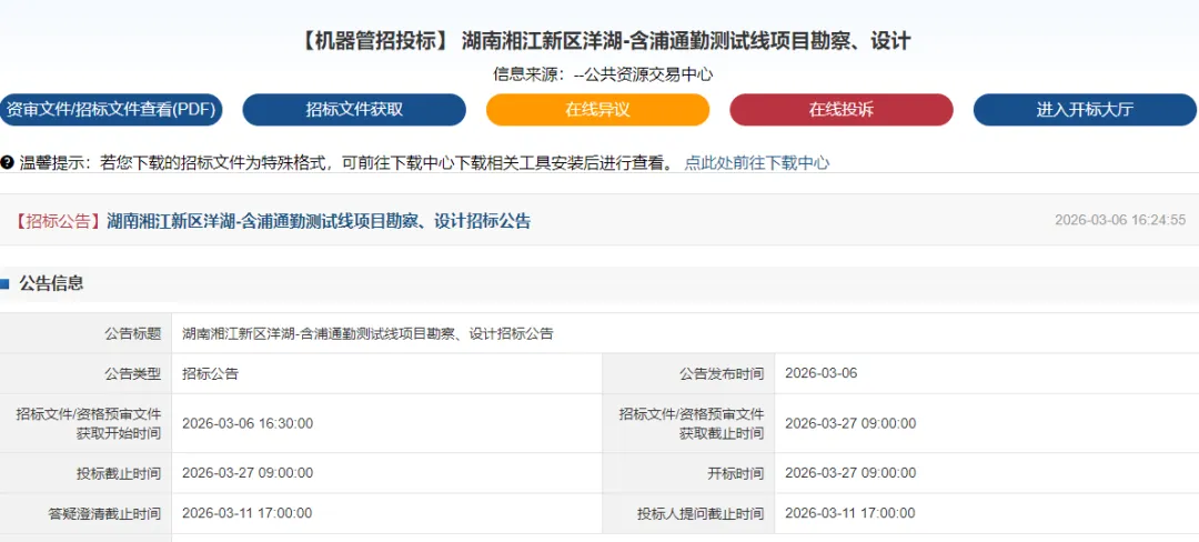 根据招标公告,湖南湘江新区洋湖-含浦通勤测试线项目勘察、设计已由湖南湘江新区管理委员会以《湖南湘江新区2026年项目投资计划》的通知及湘新发〔2026〕3号批准建设,项目业主为湖南湘江智能科技创新中心有限公司,建设资金来自财政,出资比例为国有资金:100%,招标人为湖南湘江智能科技创新中心有限公司。