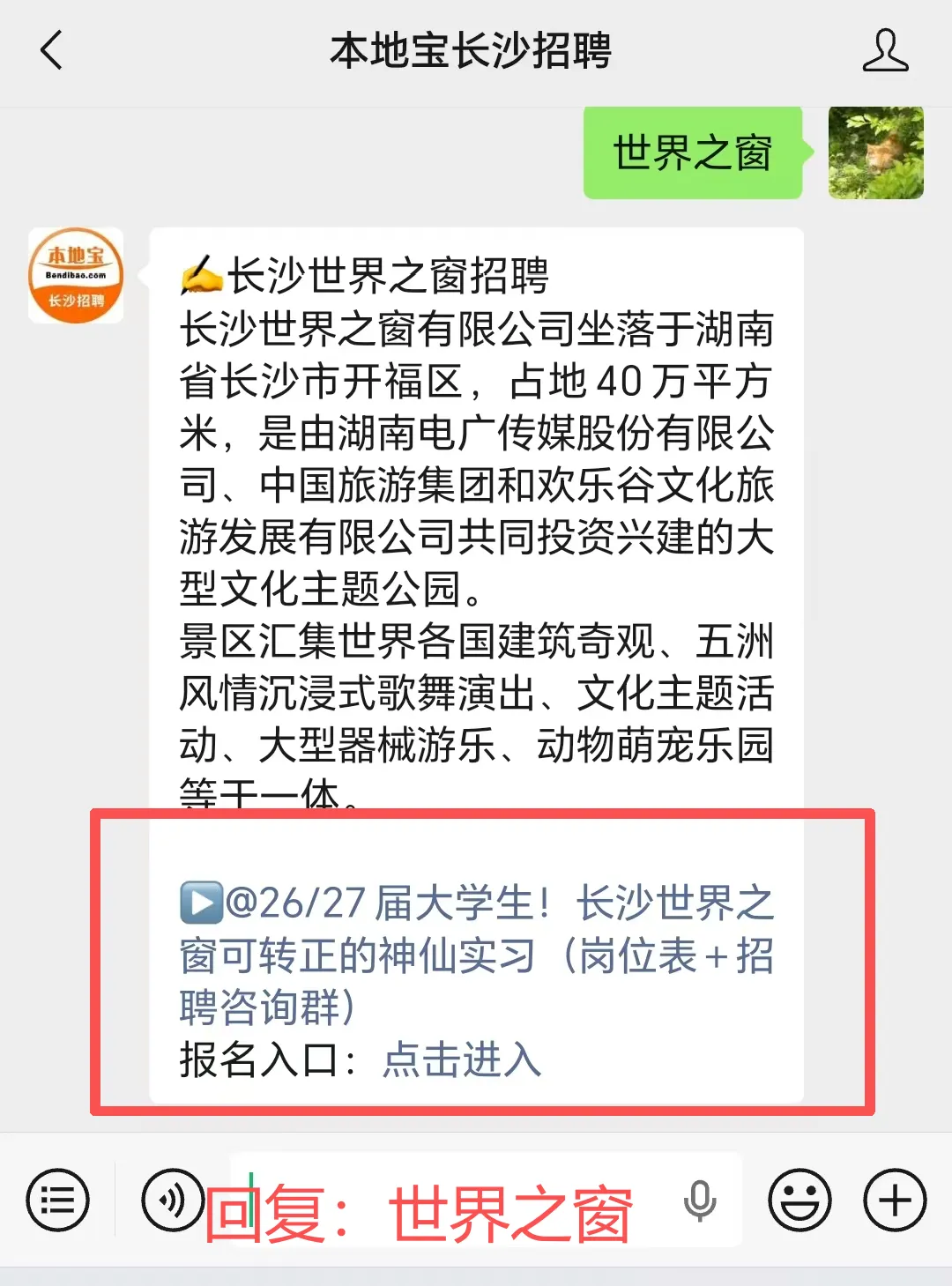 扫描下方二维码,进入【本地宝长沙招聘】,在对话框回复关键词【世界之窗】,即可快速进入长沙世界之窗网申投递入口及获取招聘咨询群、咨询电话等信息。