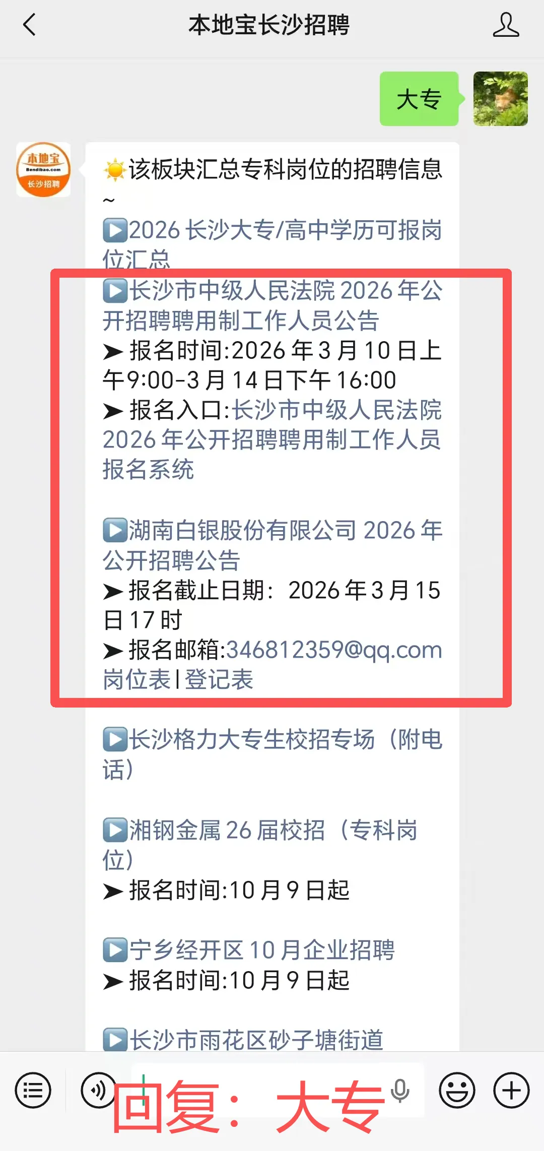 扫描下方二维码,进入【本地宝长沙招聘】,在对话框回复关键词【大专】,即获取更多湖南长沙大专可报招聘详情、报名入口、岗位表等信息。