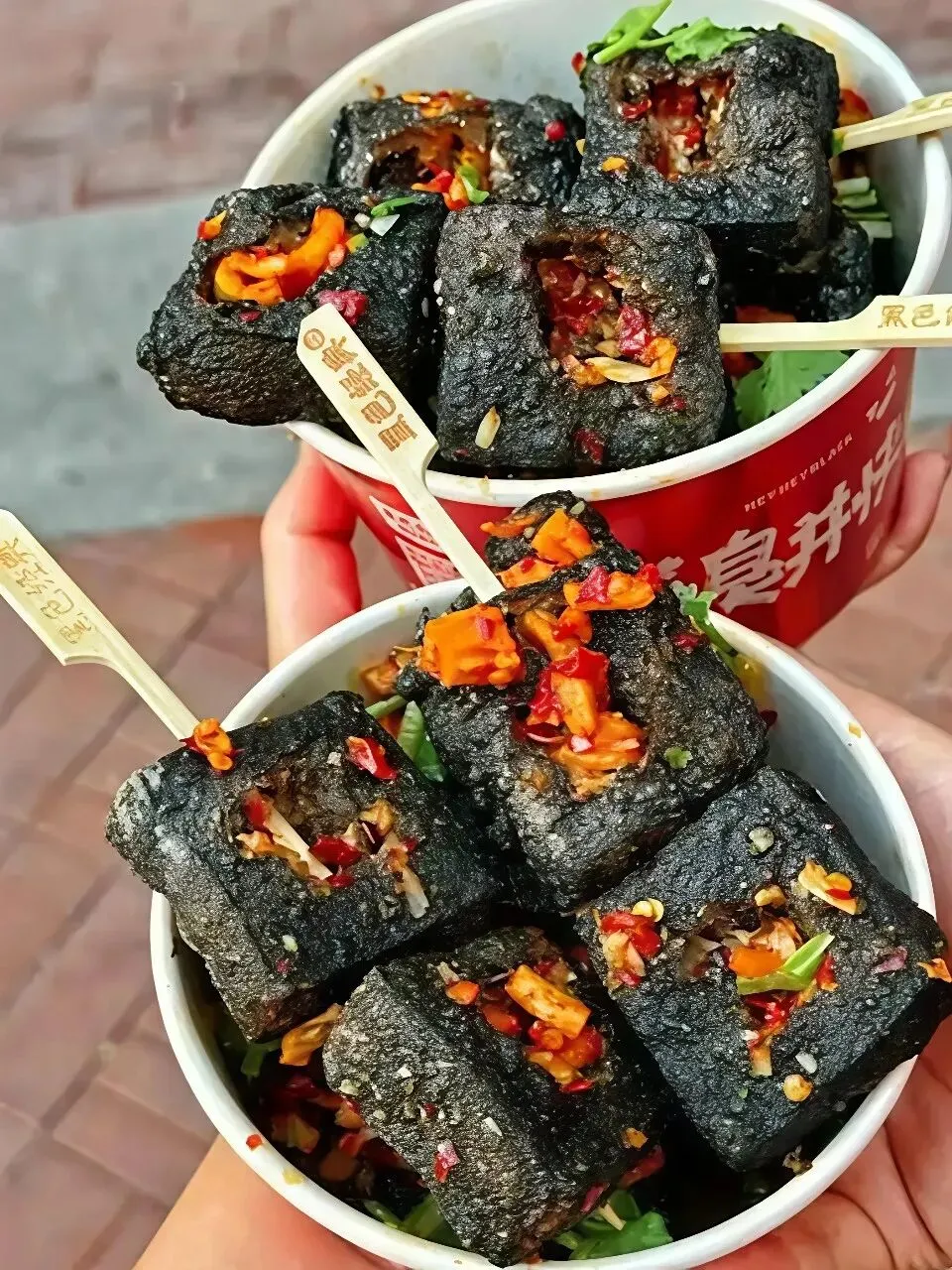 最勾人的,是它臭得独特、香得醇厚的滋味。初闻时那股淡淡的发酵香气,总让人又好奇又犹豫,可一旦入口,所有顾虑都会烟消云散。秘制卤汁的咸香、辣椒的鲜辣、蒜蓉的辛香、香菜的清新,尽数渗入豆腐的每一丝纹理,咬下的瞬间,鲜美的汤汁在口中爆开,咸鲜香辣交织缠绕,没有丝毫腥腻,只剩浓郁醇厚的豆香与调味的鲜香,越嚼越有味,越吃越上头,一口接一口根本停不下来。