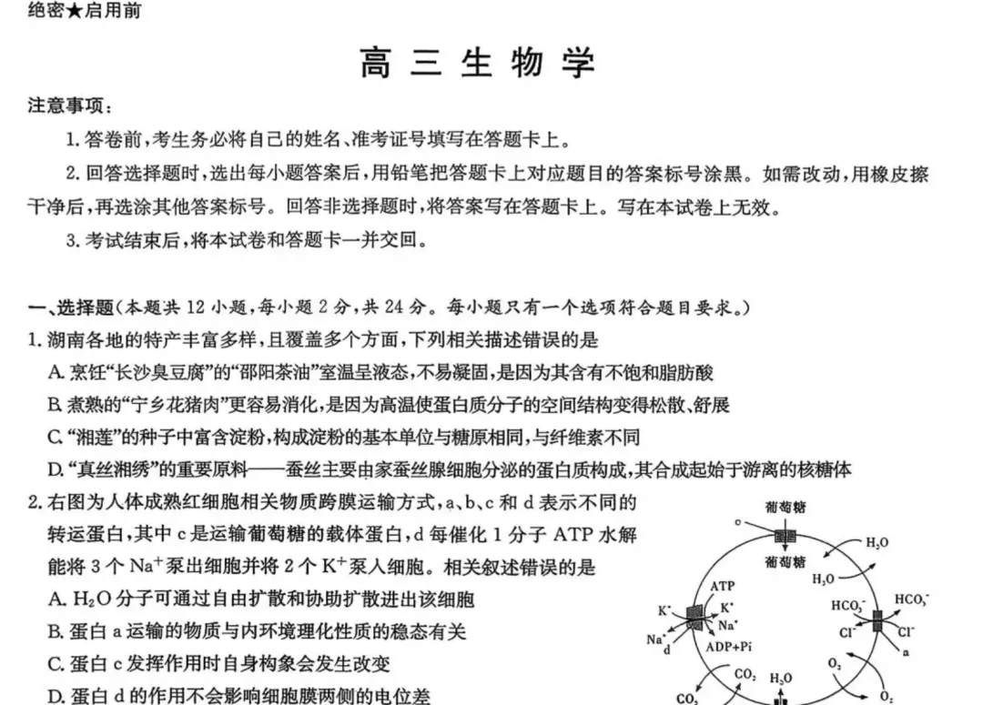 - 选择题:表面送分,背地捅刀,坑点密度拉满上来 T1 就用长沙臭豆腐、宁乡花猪肉、湘莲湘绣给你套近乎,让你放松警惕,结果 C 选项淀粉、糖原、纤维素的基本单位,D 选项蚕丝蛋白的合成场所,全是教材里最容易被忽略的细节;T5 红树林生态题,D 选项生物多样性的直接 / 间接价值,多少人考完拍大腿喊 “我怎么又记反了”;T8 细胞生命历程,把细胞坏死和凋亡混在一起,一不留神就选错。12 道单选 + 4 道不定项,没有一道是白给的,每道题都藏着 1-2 个易错点,不定项更是容错率直接为 0,多选漏选全没分,不像长沙一模的选择题,错了大多是真不会,这套卷的选择题,错了全是 “我明明会,怎么又掉坑了”,挫败感直接拉满。