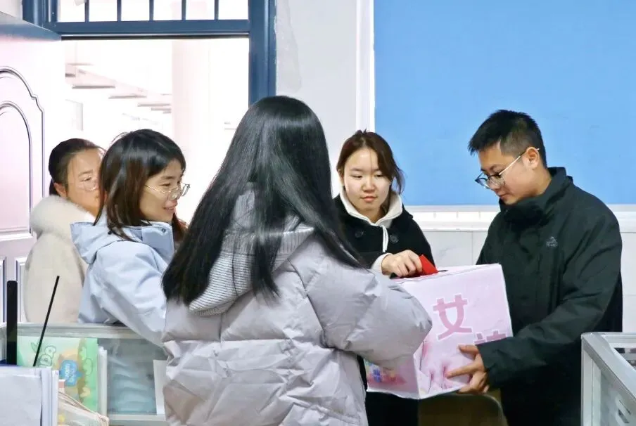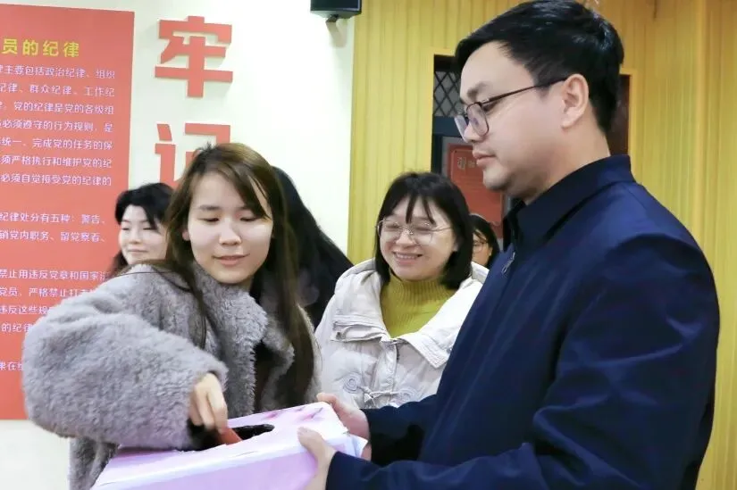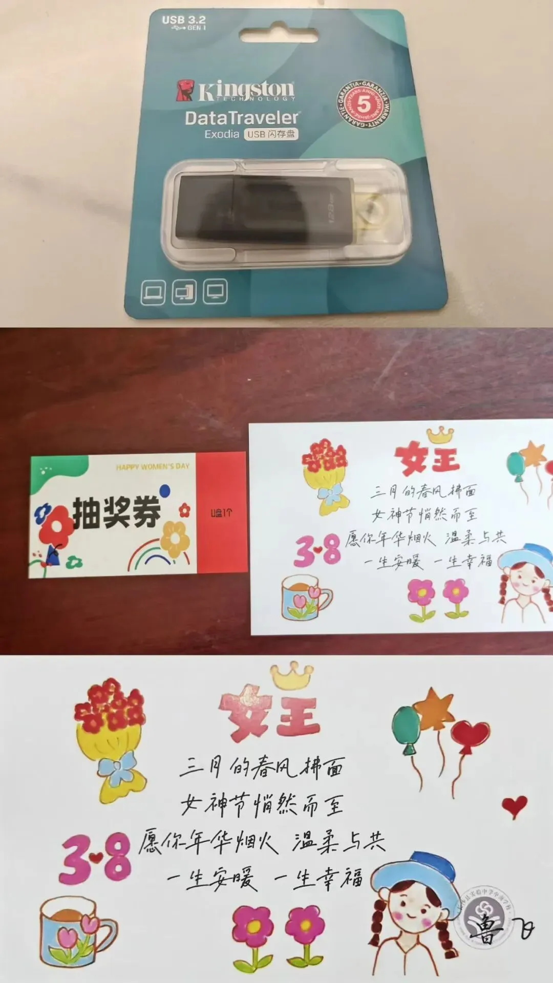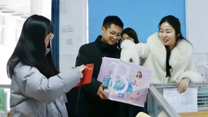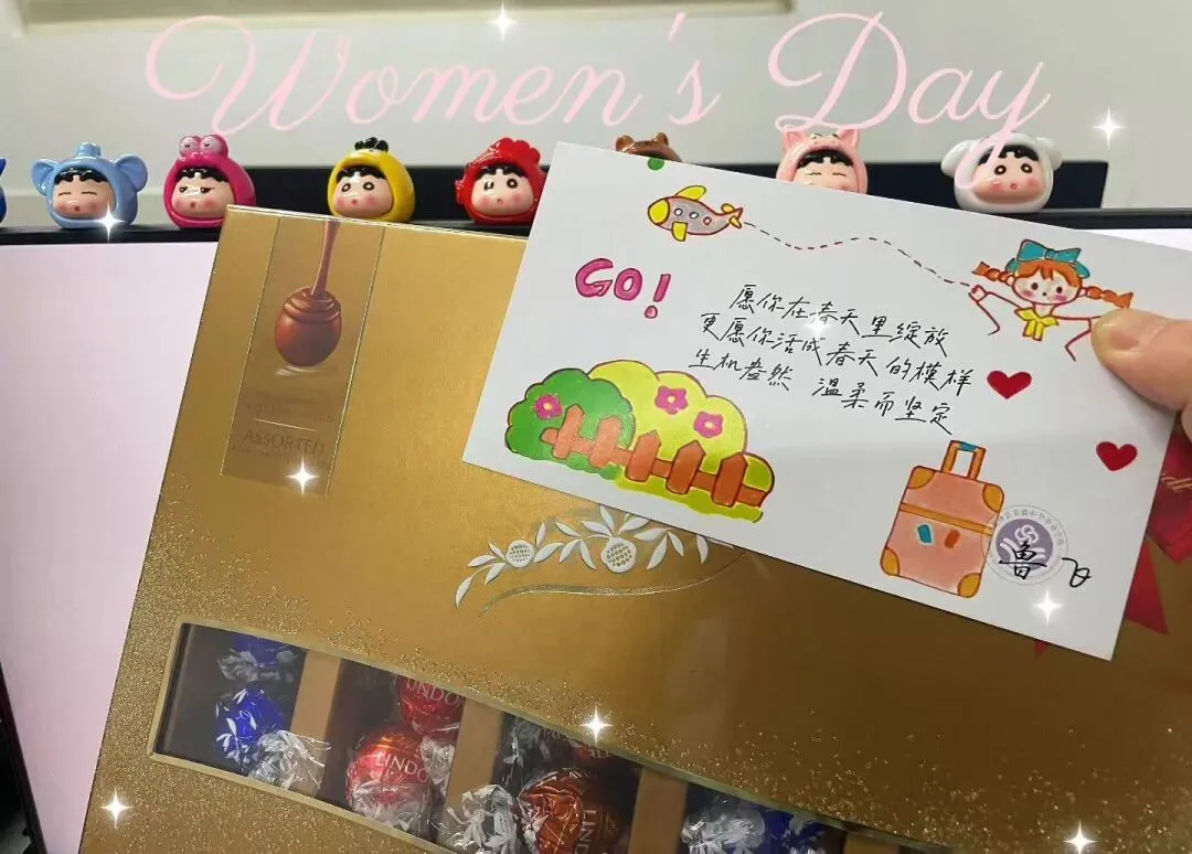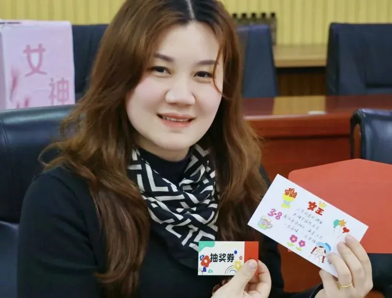 活动当天,由工会代表与学校行政老师组成的“暖心小分队”走进各办公室,带来了精心设计的抽奖箱。这个为节日特别定制的小箱精美别致,里面装满了特制的节日贺卡和奖券。女教职工们怀着期待与喜悦,亲手从抽奖箱中抽取属于自己的那一份惊喜——每一张贺卡都写满了专属祝福,每一份礼品都承载着学校的温情,感谢她们在教育教学岗位上的辛勤付出与默默奉献。现场洋溢着喜悦与感动,节日的仪式感在这一刻变得具体而温暖。