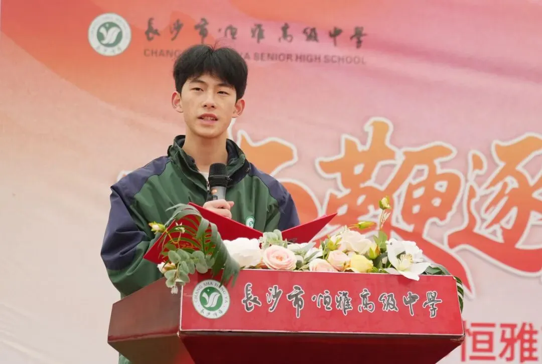 高三年级2308班优秀学生代表刘启东同学上台发言,分享自己的学习心得与成长感悟。他结合自身备考经历,畅谈学习方法与时间规划,更以同龄人的视角激励全体同学珍惜时光、奋勇拼搏。他呼吁高三同窗携手并肩、攻坚克难,以坚定的信念冲刺高考,也勉励高一、高二学弟学妹夯实基础、奋勇争先,不负韶华、不负时光,在恒雅的校园里书写属于自己的青春答卷。