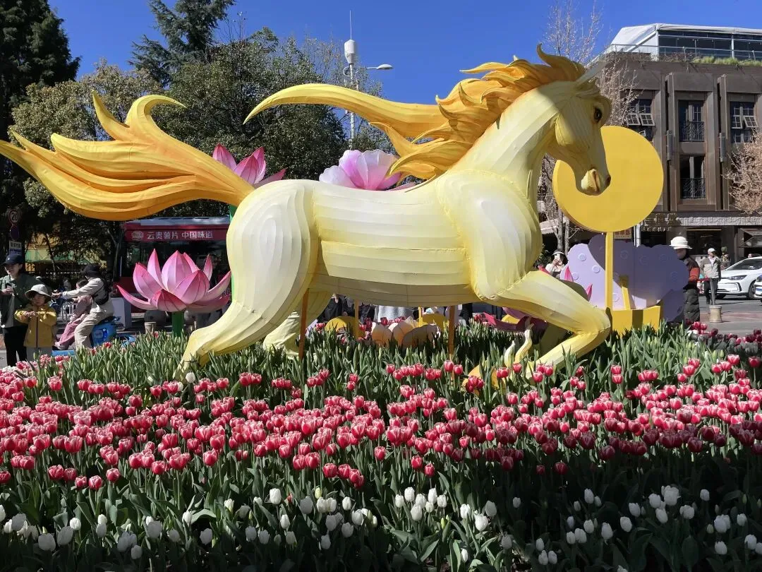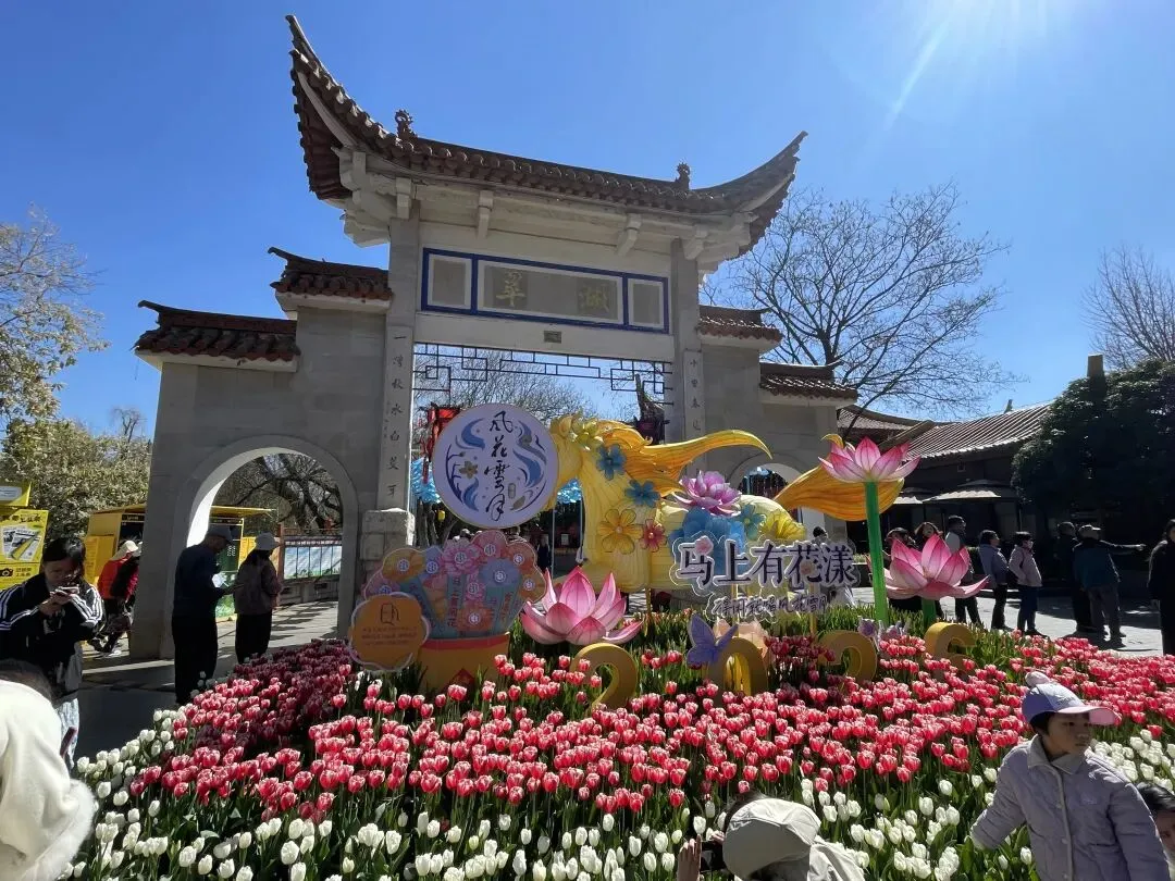 踏入翠湖公园,第一眼就被那郁金香攫住了心神,有红的、白的,红的热烈似火白的纯净如雪,簇拥着黄色的"骏马",该是马年吉祥的意思吧,旁边有广告语“马上有花漾——得闲就喝风花雪月。”进到园里,湖水绿得深沉,又清澈见底,能看见水草柔柔地招摇。岸边的垂柳,冒出嫩芽的枝条几乎要探进水里,初春的暖风贴着湖面吹来,带着水汽和青草的清新气息。走过定西桥,到堤坝交汇处便是海心亭,游览的路旁种着野罂粟、迎春柳、郁金香、鸡冠花。海心亭的亭角飞檐在午后的阳光下闪着金光,亭旁水边,柳丝在飘荡。这湖,它的生命是本记录岁月的书。