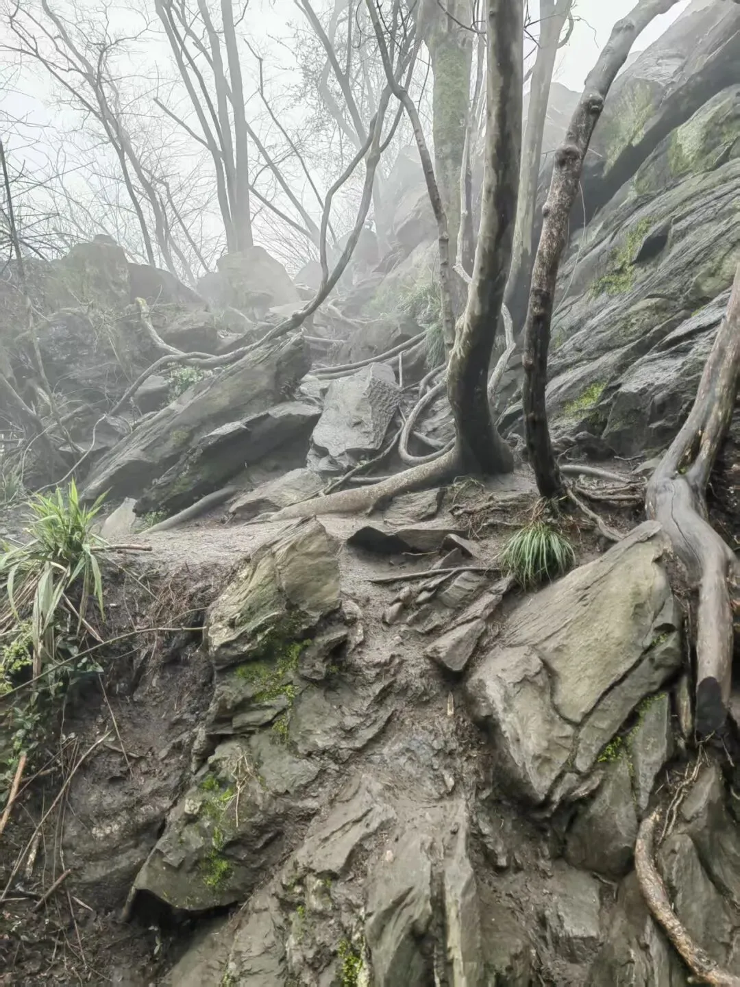 由于阴雨天气,能见度很低,越往山上走,能见度大概只有十几米。