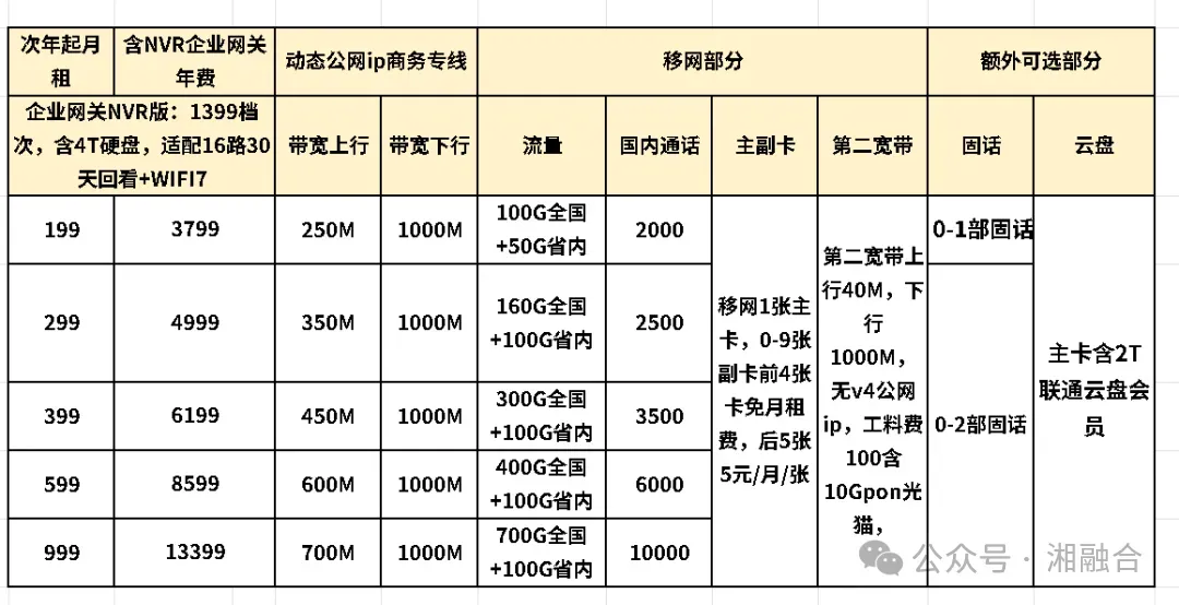 长沙联通企业宽带融合套餐:篇幅有限,介绍家庭套餐为主的帖子,只简单说一下最热门的动态公网ip的商务专线,可含固话。(这是其中一个版本,另一个版本是省内流量变定向,二宽上行50M).企业宽带的核心是,TCP会话数更高。像抖音看直播占用200会话数,王者荣耀占用100.所以家宽只够20个人同时王者荣耀。企业宽带则最便宜的都够160个人同时王者荣耀。还有上传速度,公网IP的区别。 基本构成:基础企业套餐:199-999 + 企业网关499减配版,799高配版。如:199智赋万企,一年约2400.减配版企业网关499,加起来就是2899.第二年因为没有这个费用,所以后续一直2400一年。注:特殊情况也可以按季度交。注:上行100下行1000的固定IP套餐首次预存2599.上行600下行1000固定IP套现首次预存5599. 上图来源某电商平台的东西,为了避免违规,对部分内容上了马赛克。现在存储介质疯涨,对于需要新装监控摄像头的客户很不友好。长沙联通应对这种情况,可以采用华为B896-U6压缩编码存储方案和摄像头上云方案应对成本激增。 今天,我们重新介绍华为B896-U6企业网关,也叫华为B60尊享版。它集成了录像机功能(带4T硬盘)。也叫VVR功能。可使用HDMI线连接接口分别连接华为B896-U6设备和电视机,就可以呈现出16路监控画面,配合华为超级压缩,最多30天回看。同时,含WIFI7功能,通过另购从设备实现全公司无缝漫游拓展WIFI7覆盖,全套整网带机量300台设备。采用华为B896-U6,可以省去重新采购录像机和4T硬盘。 安装华为摄像头后实现即插即用,省去了没有专人就很难维护的烦恼。设备三年维保。三年后由于是本地存储,高固定成本,低边际成本,用到坏为止。