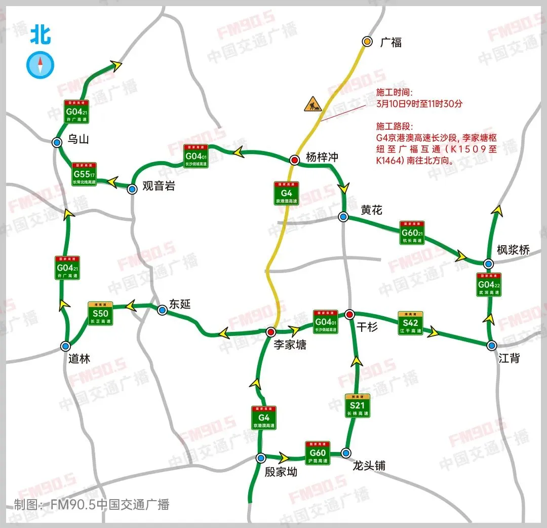 3月8日,本台记者从湖南省公安厅交通管理总队高速公路交通管理二支队、湖南省高速公路集团有限公司长沙分公司、现代投资股份有限公司长沙分公司了解到,因G4京港澳高速应急施工需要,3月10日、11日,该高速长沙广福互通至湘潭昭山互通路段将分阶段进行交通管制,届时请各位及时绕行。