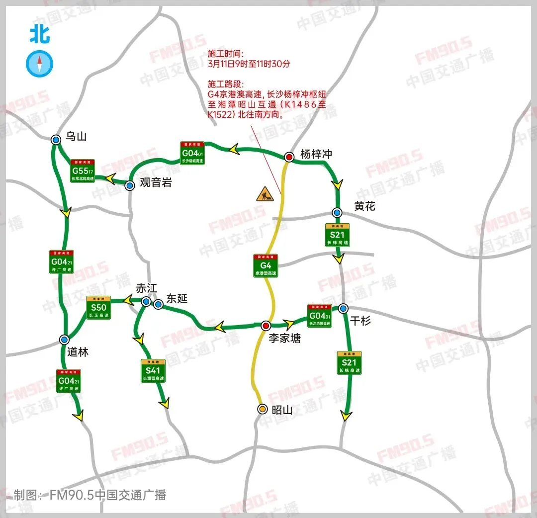 封闭位置:G4长沙段,李家塘、杨梓冲枢纽往南匝道。