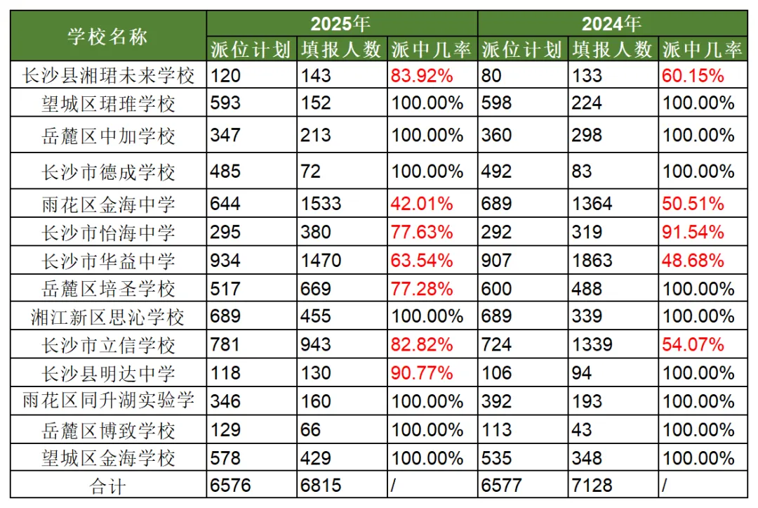 今年2025年长沙的小升初派位和往年的数据确实有很大的不同,民办初中派中率排名有很大变化。