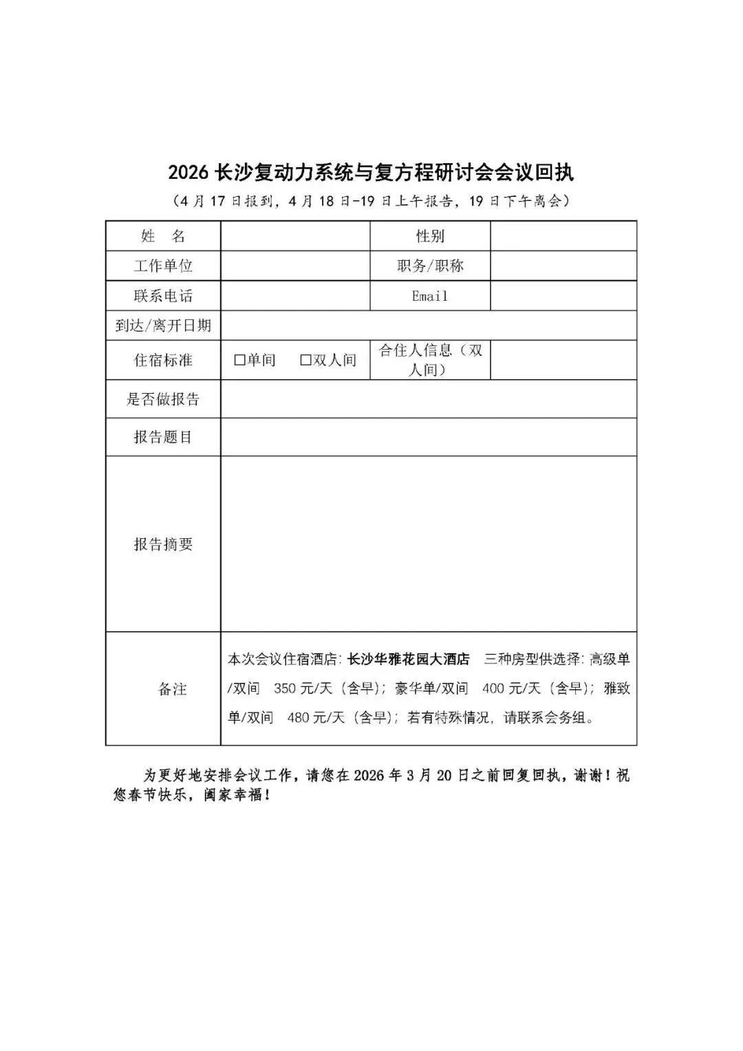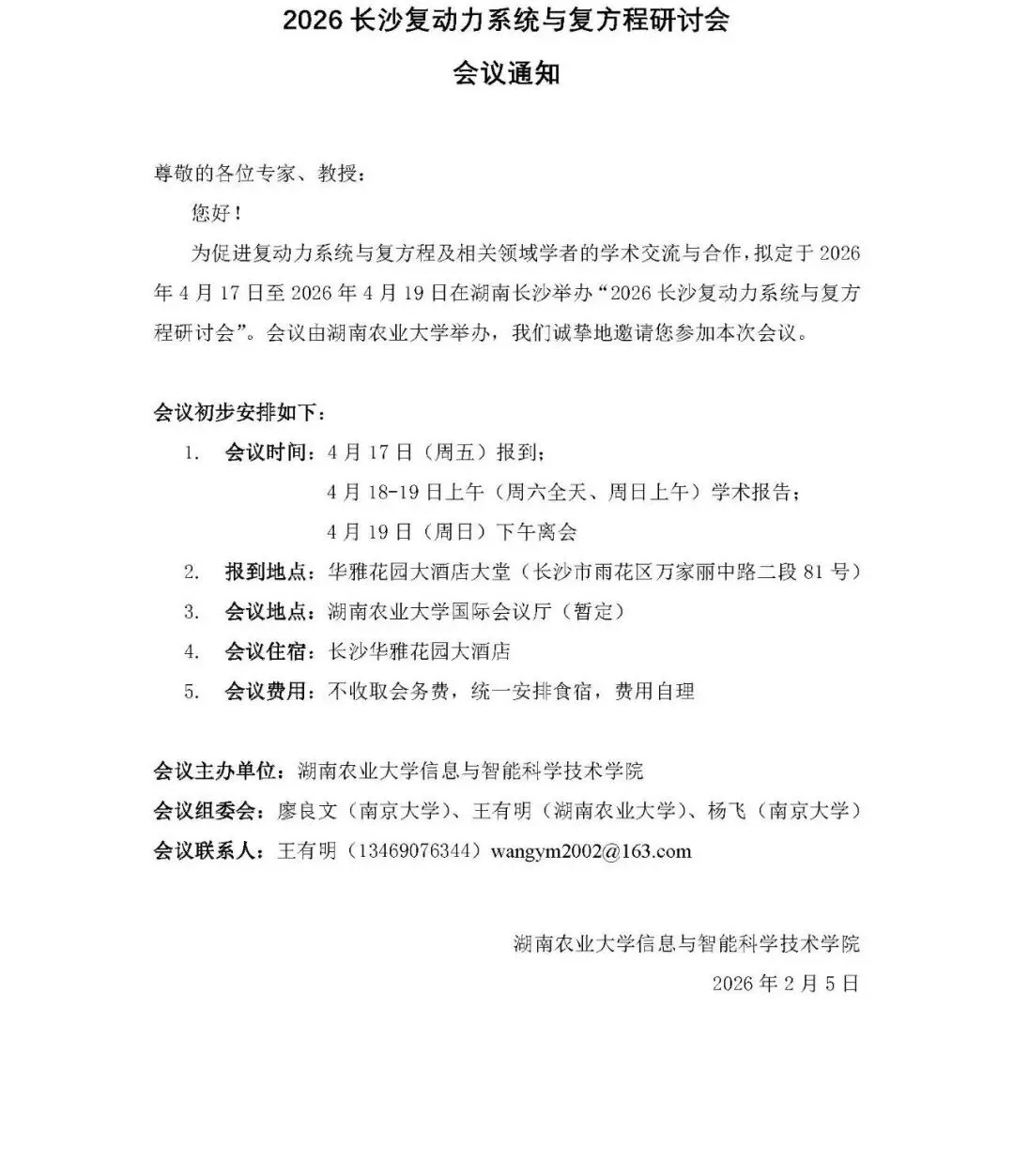 为促进复动力系统与复方程及相关领域学者的学术交流与合作,拟定于2026年4月17日至2026年4月19日在湖南长沙举办“2026长沙复动力系统与复方程研讨会”。会议由湖南农业大学举办,我们诚挚地邀请您参加本次会议。