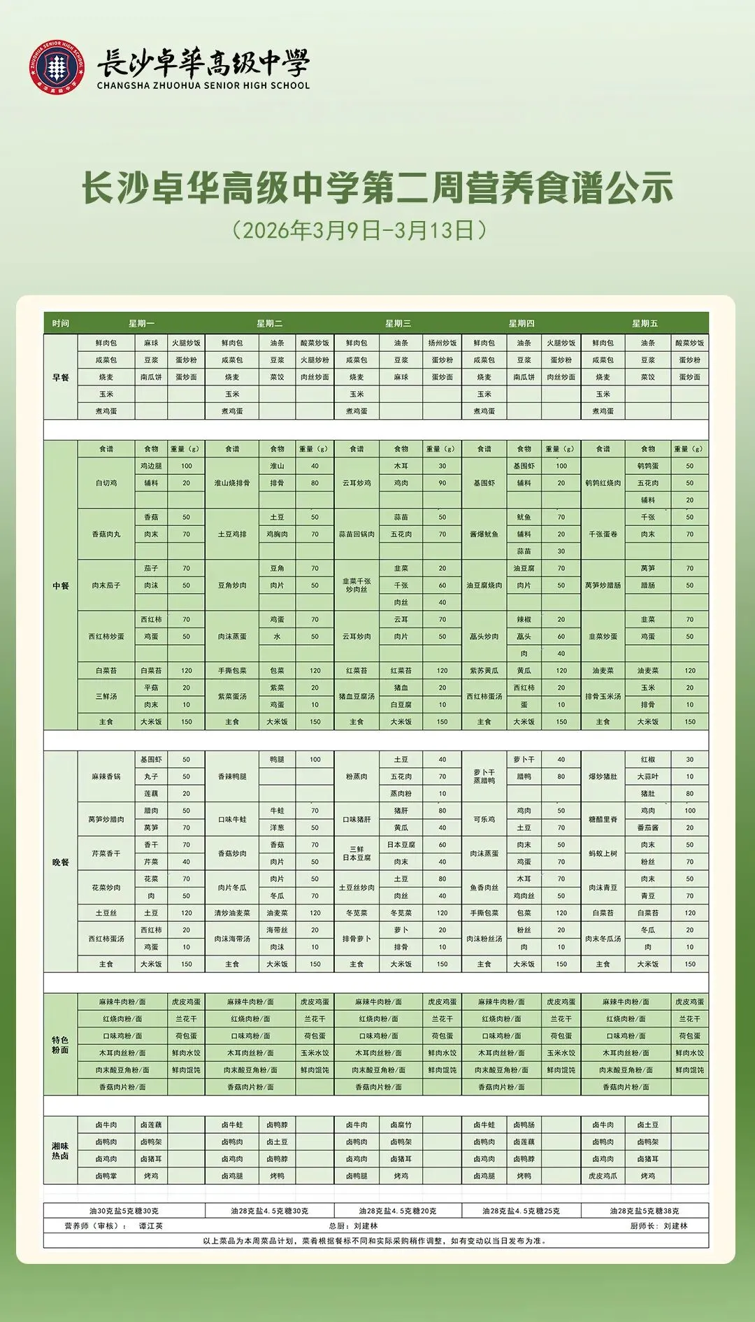 卓越“食”光 | 长沙卓华高级中学第二周营养食谱公示