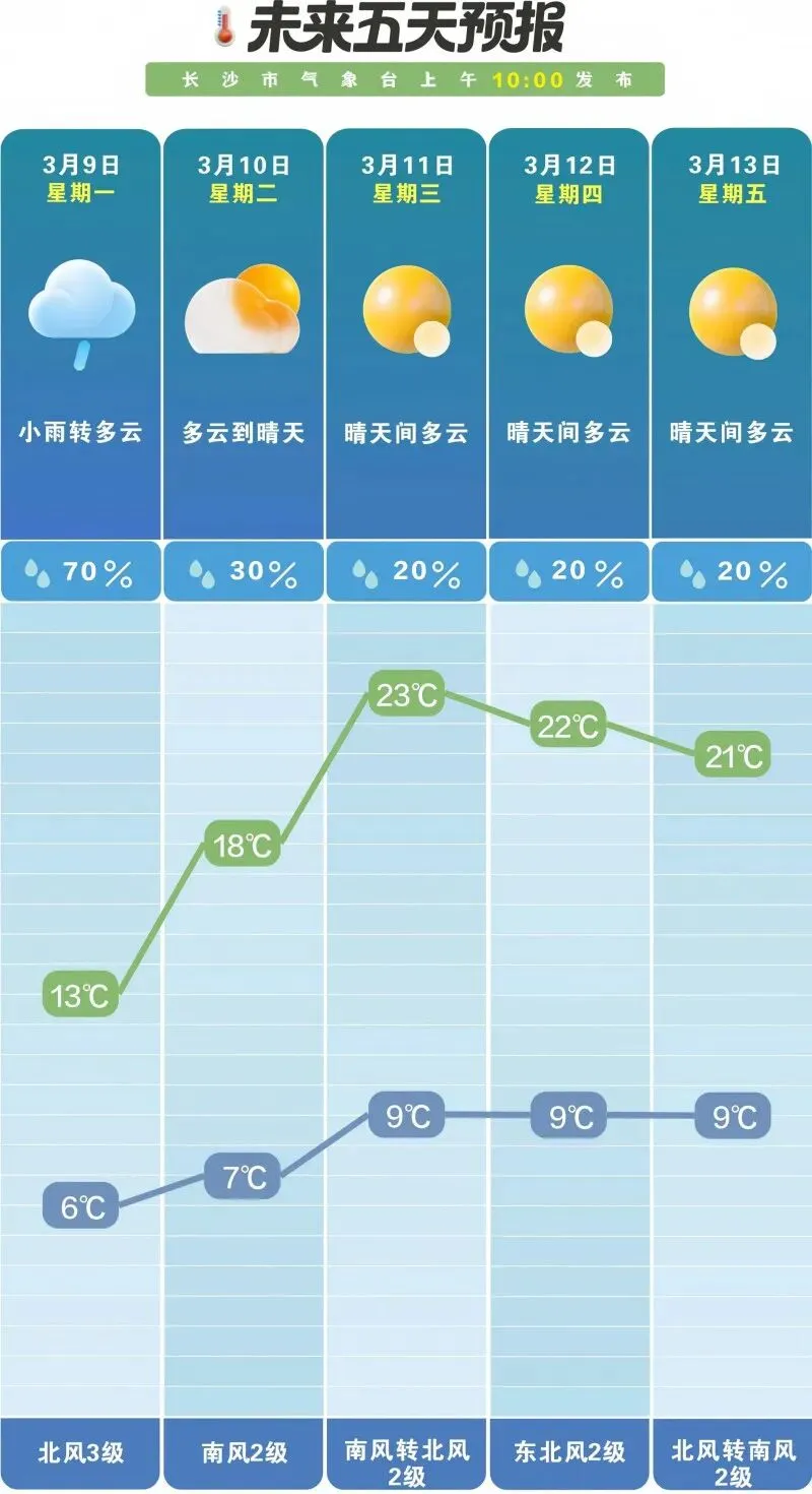 从10日开始,长沙的天气将上演一出“绝地反击”:多云到晴天率先登场,虽然最低气温只有7℃,但午后最高气温会迅速窜到18℃;到了11日、12日、13日,“晴天间多云”的好天气套餐连上3天,最高气温23℃,最低气温也回升到9℃。微风轻拂,不湿不燥,有了春天的模样。