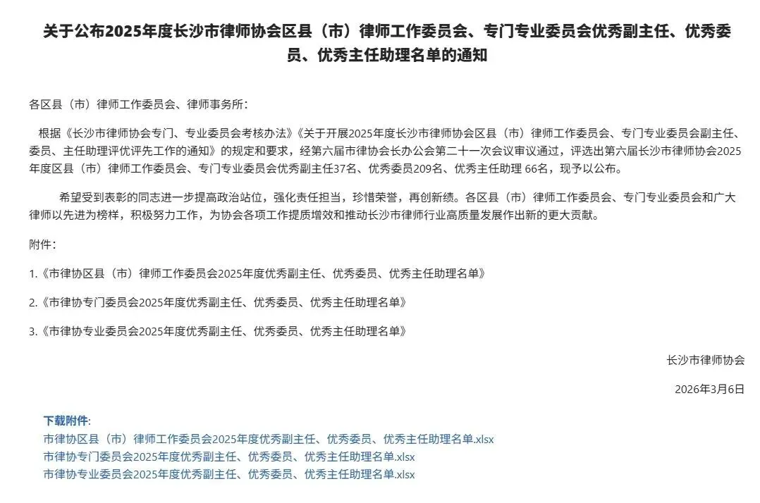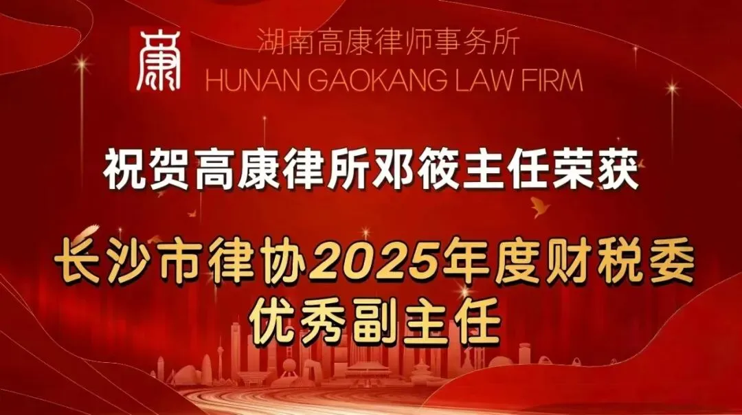 为树立标杆、弘扬先进,长沙市律师协会于2026年3月6日公布了2025年度长沙市律师协会区县(市)律师工作委员会、专门专业委员会优秀副主任、优秀委员、优秀主任助理的名单,高康律所主任邓筱律师以其深厚的专业能力和对行业的积极贡献,荣获“2025年度财税法律专业委员会优秀副主任”称号。这一荣誉,既是市律师行业对邓筱律师专业能力与奉献精神的肯定,也是高康律所坚持专业化、精品化发展的体现。未来,高康律所将继续秉持“专业、精致、高效”的理念,再接再厉,为推动行业高效持续发展、法治社会作出更大贡献。