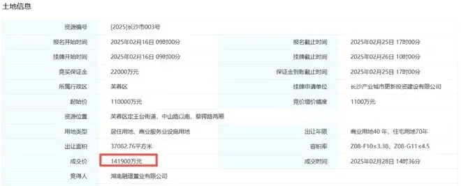 2025年2月湖南融璟置业有限公司摘得商住用地,溢价29%,折合楼面价9435元/㎡。