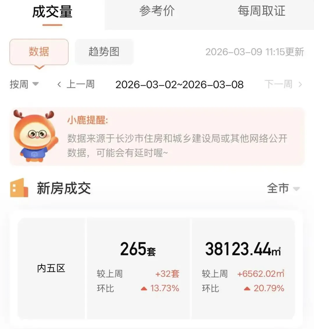 据长沙小鹿购房小程序显示,2026年3月首周长沙网签新房住宅成交265套,较上月增加32套,环比上涨13.73%。(3月2日-3月8日)