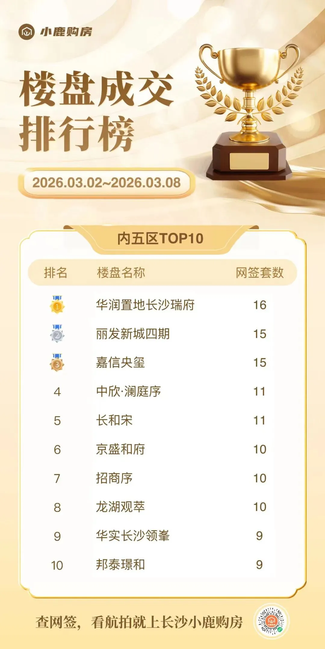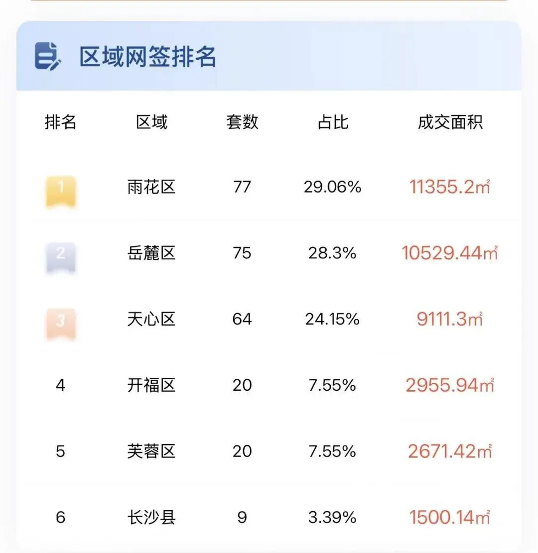 上周长沙内五区成交排行榜出炉,内五区网签成交数据排名前3,长沙瑞府(16套)、丽发新城(15套)、嘉信央玺(15套)。