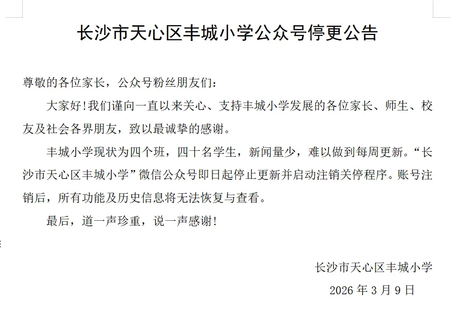 >长沙市天心区丰城小学公众号停更通知