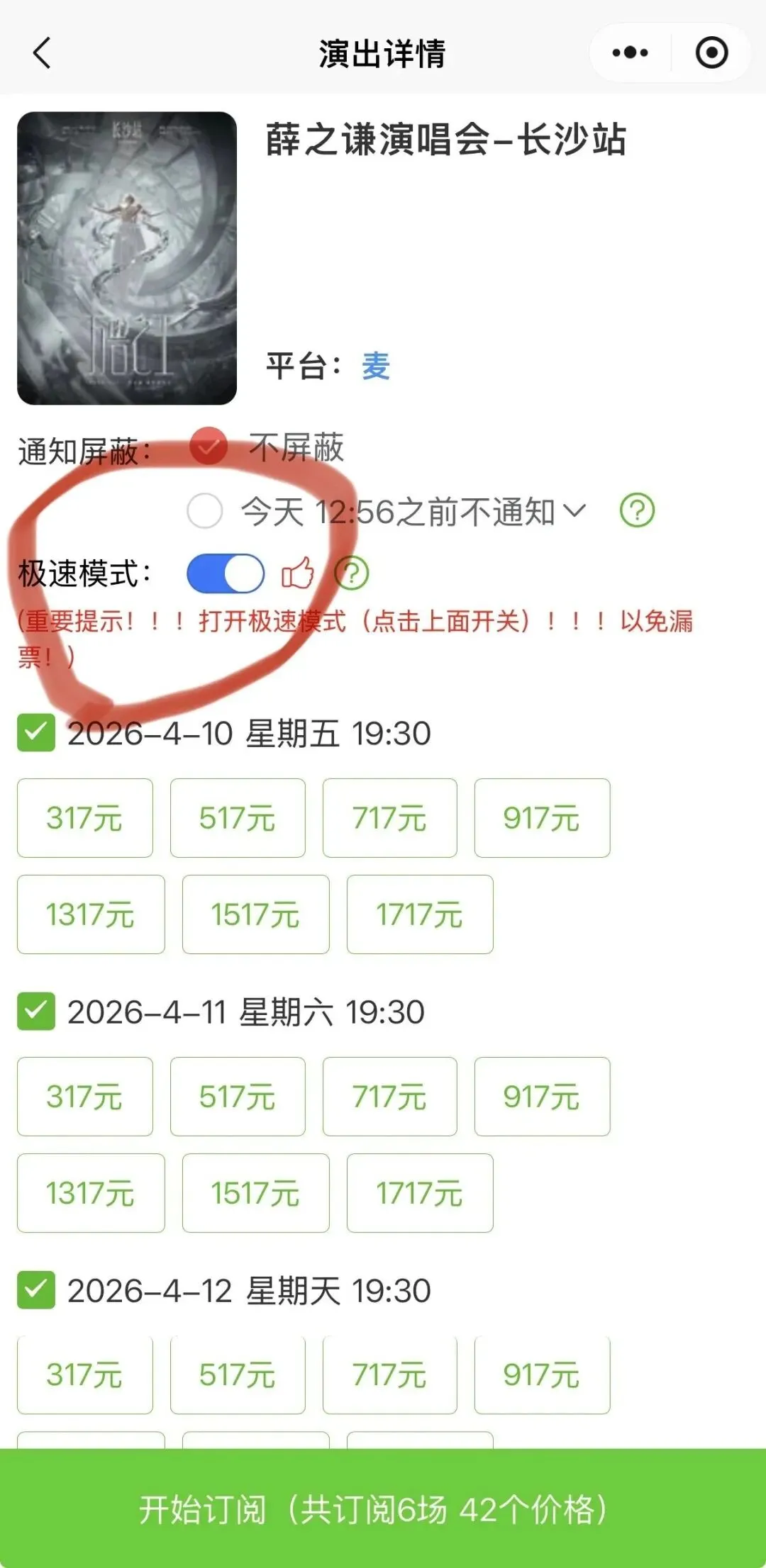 【麦】【猫】三开前没有回流放出,三开后预计有回流放出;【我漂漂】长沙站也在这个平台开售啦,监控小哥也在帮大家盯着,大家可期待一下后续有没有回流,建议尝试蹲一下这个平台哦!!!记得把【麦】【猫】【我漂漂】这三个平台都订阅上!!!防止漏票!!!以上是我们根据以往经验推测分析,不做准确保证,仅供参考大家记得检查下订阅状态!!!开通了会员的可以看下有没有打开“无限订阅功能”(pro自动打开)和查看下通知次数是否还有,没有开通会员的记得上一次通知过后需要重新订阅!!!2.切记别只订阅某一个价格,建议所有价格都订阅上,因为很多时候一开始只放其中的1、2个价格,然后第一波收到通知的人就会在页面蹲,然后等到放你订阅的价格的时候,第一波收到通知的人就会比你快!!!人家买了你才收到通知!!!3.把票务平台-薛之谦长沙站的购票页面放在手机后台别关闭,收到通知后立即切过去!!!别等收到通知后再打开软件,那么就会比人慢几秒,这种超热门演出就是争分夺秒的4.如果收到通知切过去发现还是没有票,那么请刷5-15分钟,看前面会不会有没有付款的继续放出来或者会放第二波票因我们是人工监控且人力有限,如发现有票我们将尽我们所能用最快的方式通知您!!