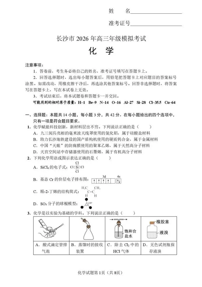 >【高一、高二、高三最新月考试卷】湖南长沙市2026届高三上学期模拟考试化学试题+答案