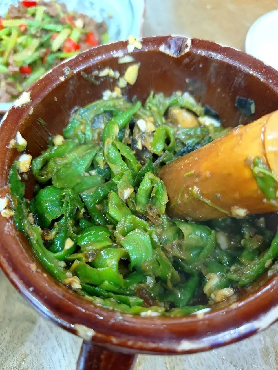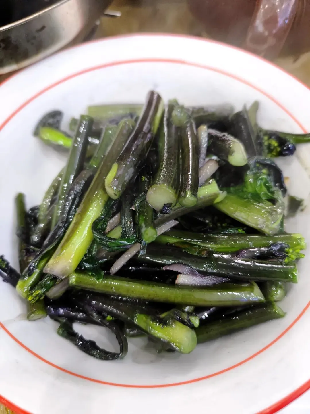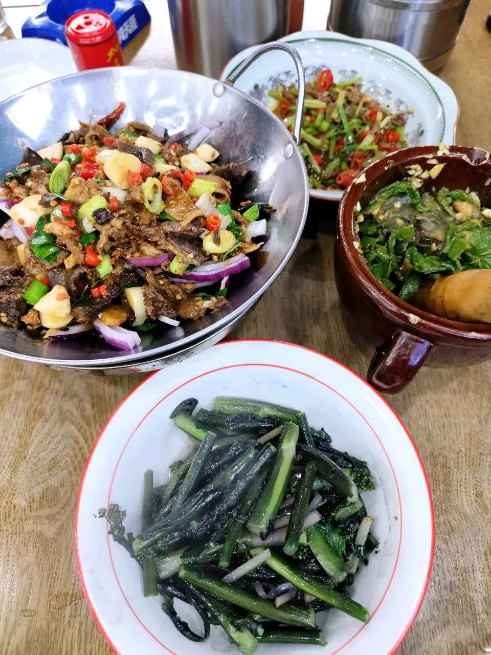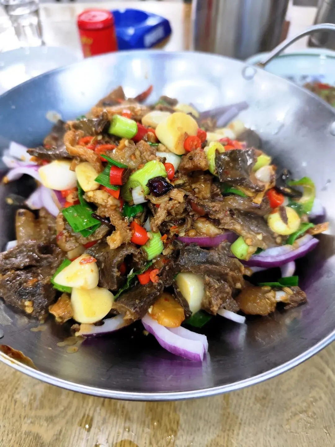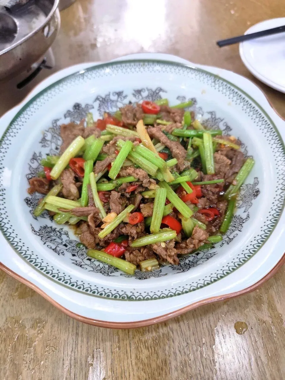牛杂用量比较保守一点,锅下面有大量洋葱,牛杂里面也有不少大蒜子、青蒜苗。我们要求微辣,味道还算不错,牛杂火候到位,软糯易嚼。用的是芹菜作为配菜,长沙这边网红的几家湘菜馆,基本上都是用香菜。也是要求微辣的口味,但实际辣度也不低,牛肉还算细嫩。青椒去皮,青椒厚实,绵软,有皮蛋的香气,辣度很轻微,不错。红菜苔摘成长节,很细嫩,基本上没有苦味,品质还是很好,这道菜用油量也不大,用了一小撮嫩姜丝调味,姜的香味不算明显。每道菜份量尚可,三个人四个菜,自然是完全够吃了。