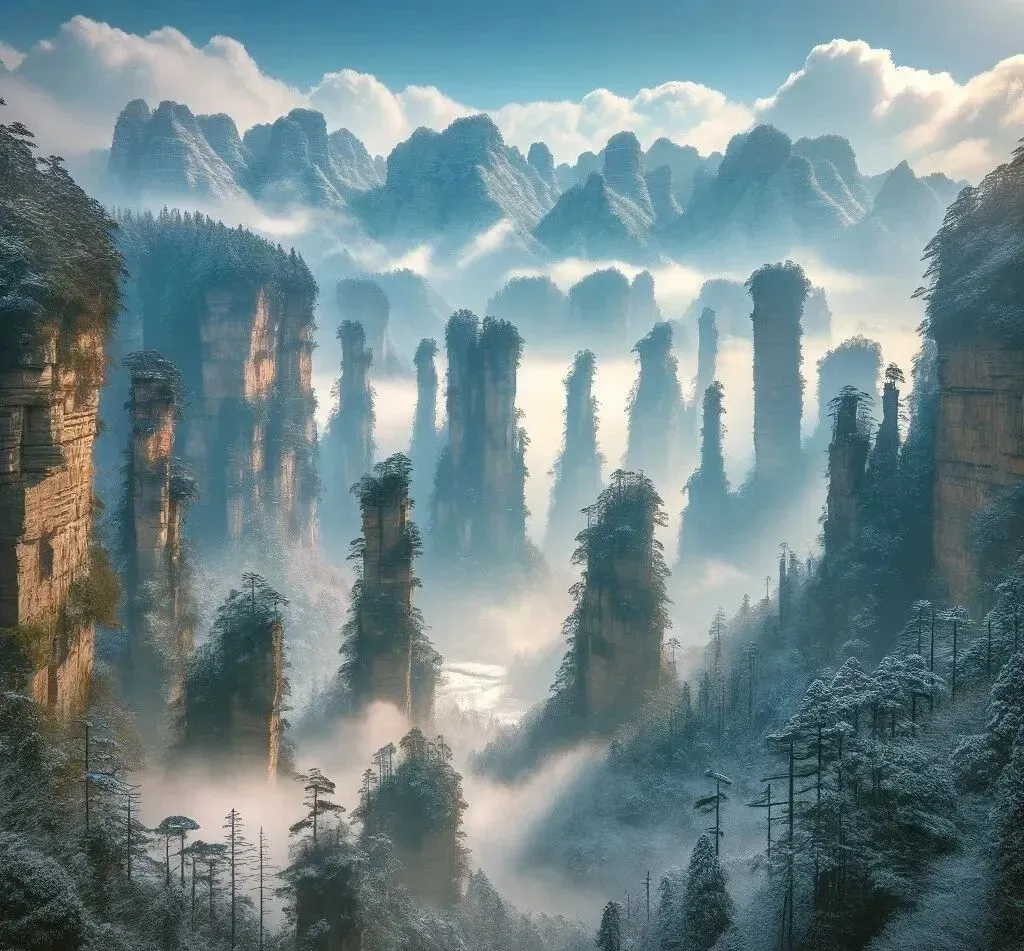 走进张家界,你会被眼前的景色所震撼。看那些山峰,有的如利剑直插云霄,有的如仙女下凡,婀娜多姿。山间溪流潺潺,清澈见底,仿佛能听到大自然的呼吸声。