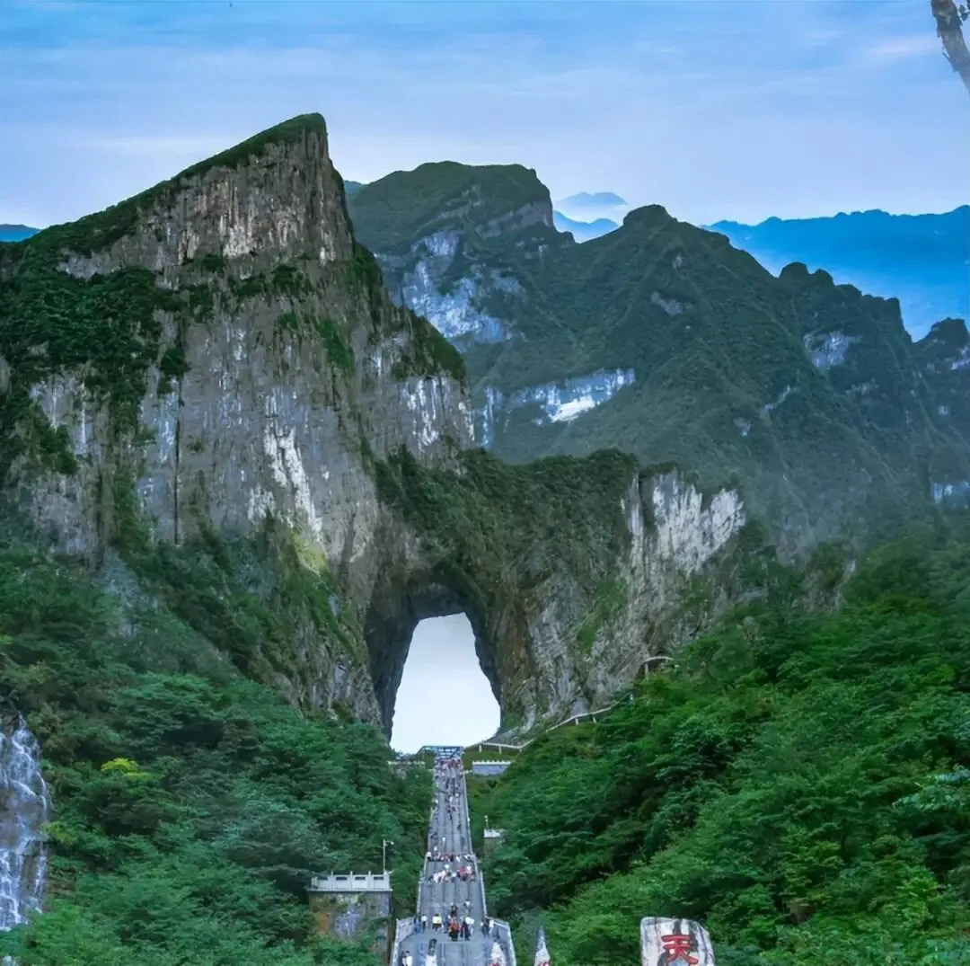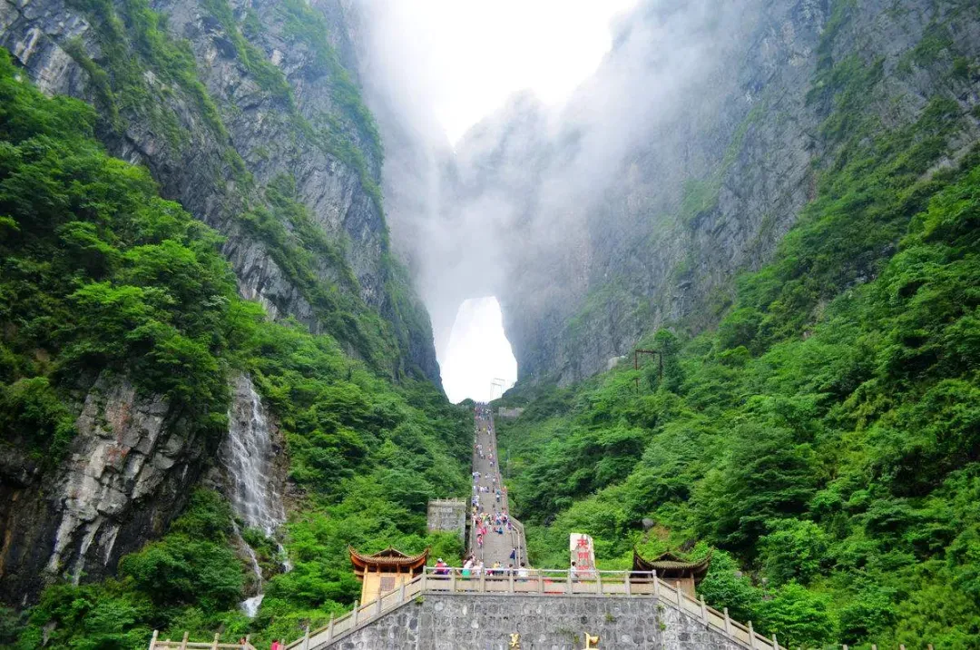天门山海拔1518.6米,山体四周绝壁,拔地临空,气势冲天,发育着成熟的喀斯特岩溶地貌,于高绝奇险中更见秀丽宜人。